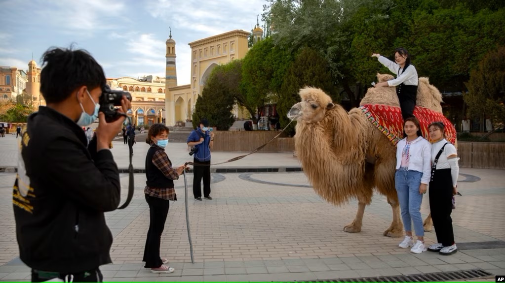 FILE – Tourists pose for photos with a camel outside the Id Kah Mosque in Kashgar in western China’s Xinjiang Uyghur Autonomous Region, as seen during a government organized trip for foreign journalists, on April 19, 2021.