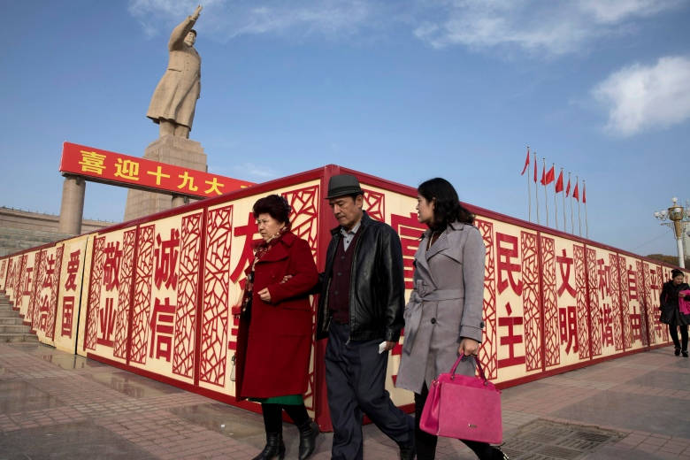 Residents walk past a statue showing Mao Zedong near billboards with the words for “Patriotism” and “Democracy” near a square in Kashgar in western China’s Xinjiang region. Chinese officials say ideological changes are needed to fight Islamic extremism. (Ng Han Guan/Associated Press)