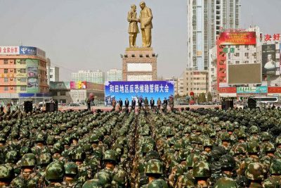 Geçen yıl Hoten’de bir mitingde Çin askeri polisi. Şehirdeki okullar, hastaneler ve diğer tesisler dikenli tellerle çevrilidir. KrediAgence France-Presse – Getty Images