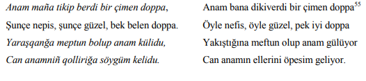 diyerek annesinin emeklerinin farkında olduğunu, ona olan saygısının zihnine kazındığını güzel dizelerle kağıda döker. “Kiçik Bala Emesmen” (Çocuk Değilim)56 başlıklı şiirinde