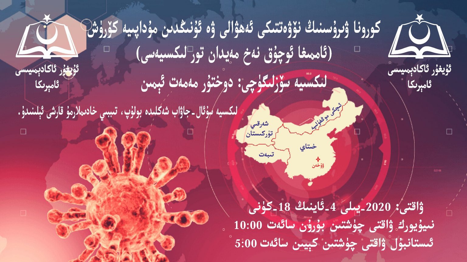 Amerikan Uygur Akademisi tarafından düzenlenen Dr.Mehmet Emin, Corona virüsünün mevcut durumunu ve önlenmesi hakkında 18 Nisan 2020 Cumartesi günü New York Saatiyle (17:00 İstanbul saati) 10: 00’da canlı yayında Bir sunum verildi.