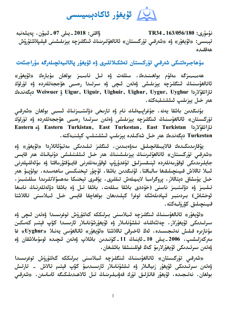 PDF ھۆججەت: «ئۇيغۇر» ۋە «شەرقىي تۈركىستان» ئاتالغۇلىرىنىڭ ئىنگلىزچە يېزىلىشىنى قېلىپلاشتۇرۇش ھەققىدە