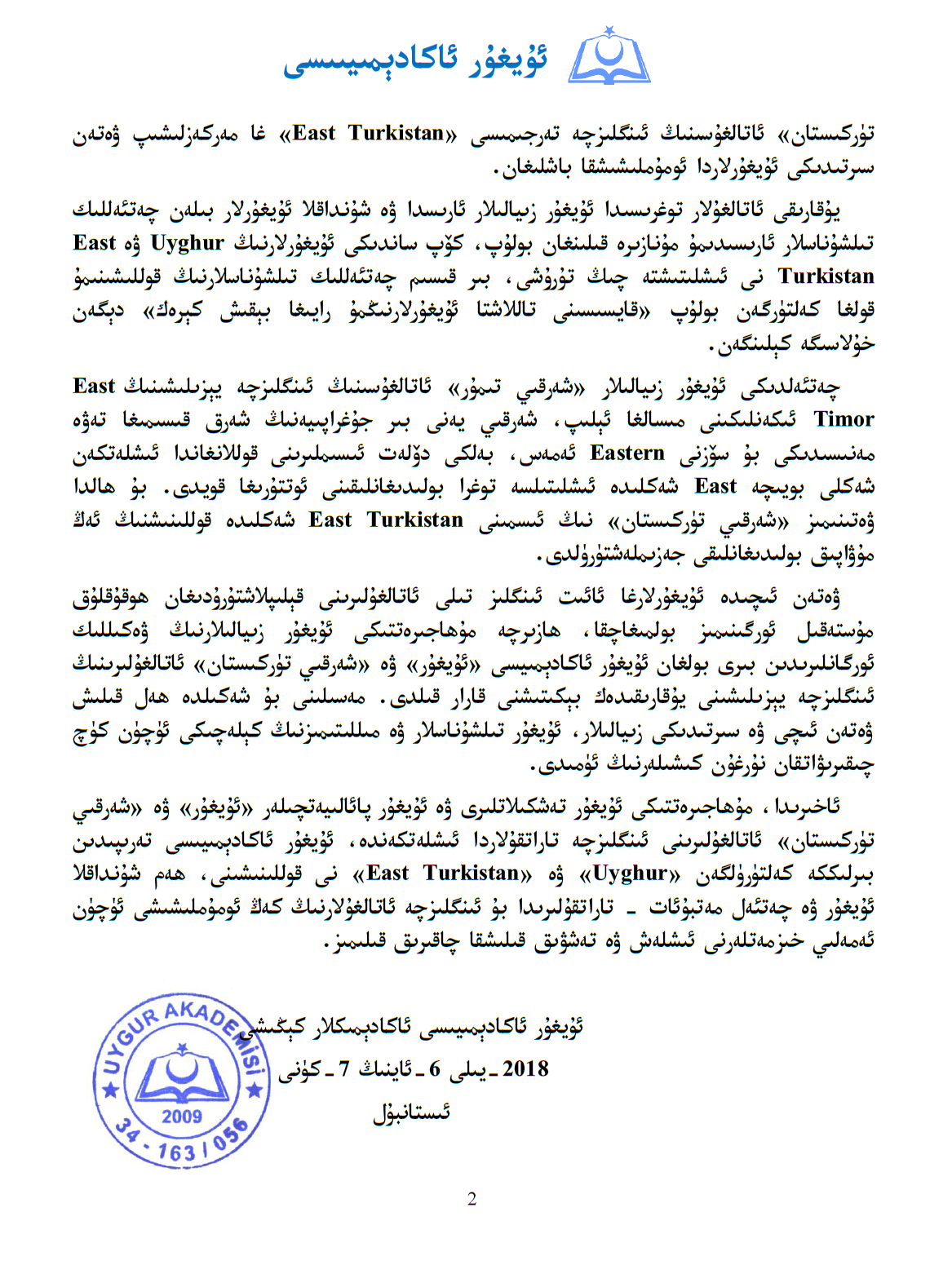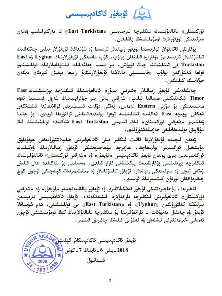 ئاخىرىدا، مۇھاجىرەتتىكى ئۇيغۇر تەشكىلاتلىرى ۋە ئۇيغۇر پائالىيەتچىلەر «ئۇيغۇر» ۋە «شەرقىي تۈركىستان» ئاتالغۇلىرىنى ئىنگلىزچە تاراتقۇلاردا ئىشلەتكەندە، ئۇيغۇر ئاكادېمىيىسى تەرىپىدىن بىرلىككە كەلتۈرۈلگەن «Uyghur» ۋە «East Turkistan» نى قوللىنىشىنى، ھەم شۇنداقلا ئۇيغۇر ۋە چەتئەل مەتبۇئات – تاراتقۇلىرىدا بۇ ئىنگلىزچە ئاتالغۇلارنىڭ كەڭ ئومۇملىشىشى ئۈچۈن ئەمەلىي خىزمەتلەرنى ئىشلەش ۋە تەشۋىق قىلىشقا چاقىرىق قىلىمىز.