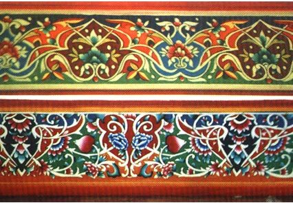 ئانار نۇسخىسى قانۇنىيەتلىك، رەتلىك، ئەركىن شەكىللىك نۇسخا بولۇپ، ئۇزۇنىسىغا ۋە توغرىسىغا كېڭىيەلەيدۇ. شوخ كۆك ۋە كۆك رەڭلەر تەگلىك رەڭ قىلىنىدۇ، كىشىگە جىمجىت، ئېغىر – بېسىقلىق ۋە قانائەت تۇيغۇسى بېرىدۇ.