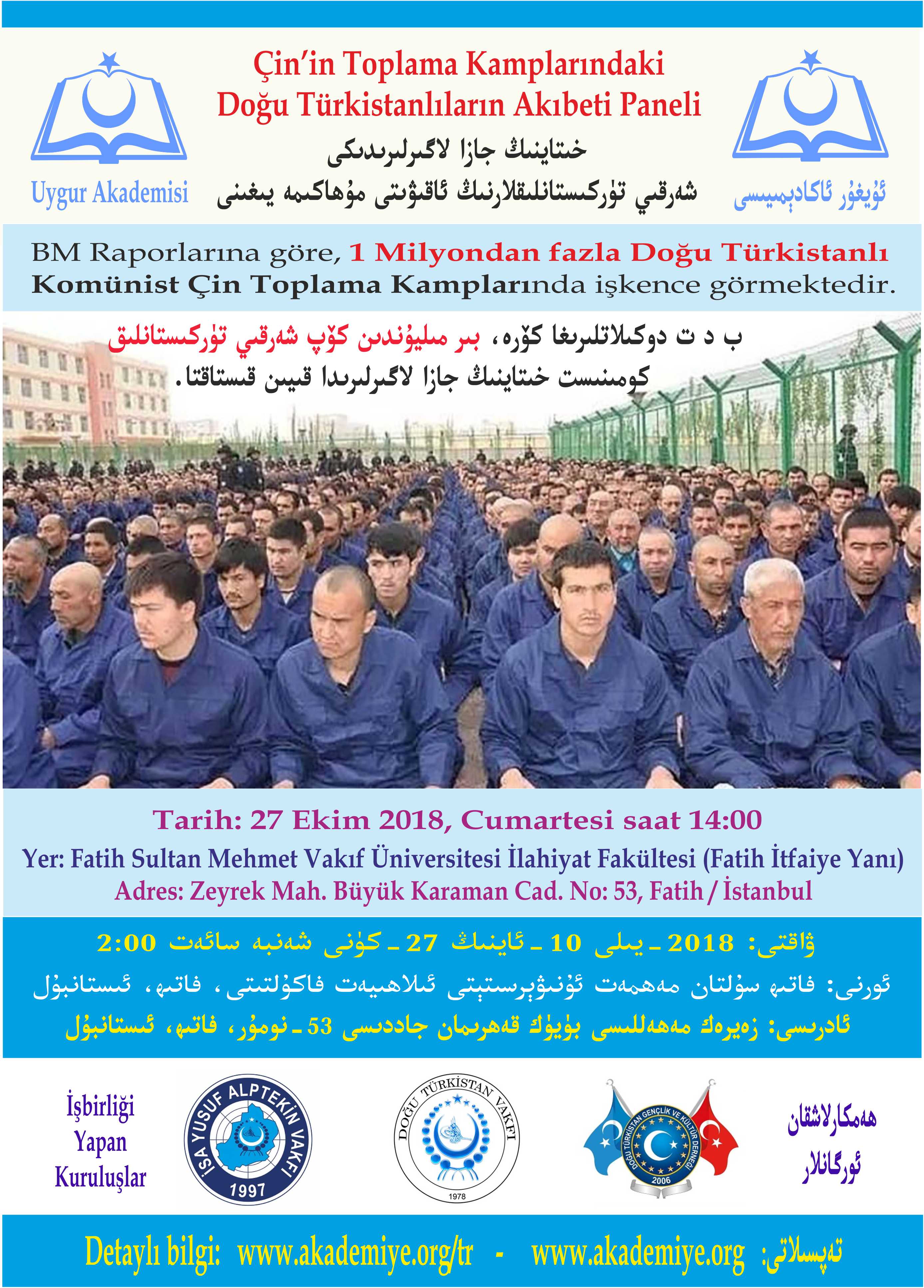 ئۇيغۇر قاتارلىق شەرقىي تۈركىستانلىقلار سولانغان خىتاينىڭ ئۆلۈم لاگىرى ئۈستىدە مۇھاكىمە ئېلىپ بېرىش ئۈچۈن كۆزگە كۆرۈنگەن 6 شەرقىي تۈركىستانلىق ۋە تۈركىيەلىك تەتقىقاتچىنىڭ دوكىلات بېرىشى ۋە جانلىق شاھىت ئۆمىر بەكئالى ئەپەندىنىڭ شاھىتلىق بېرىشى ئارقىلىق، ئۇيغۇر ئاكادېمىيىسى بىلەن شەرقىي تۈركىستان ۋەخپى، ئەيسا يۈسۈپ ئالپتېكىن ۋەخپى ۋە شەرقىي تۈركىستان ياشلار جەمىئىيىتىنىڭ ھەمكارلىقىدا 2018-يىلى 27-ئۆكتەبىر شەنبە كۈنى چۈشتىن سائەت 2:00 دە ئىستانبۇل فاتىھ رايۇنىدىكى فاتىھ سۇلتان مەھمەت ۋەخپە ئۇنىۋېرسىتېتى ئىسلامىي ئىلىملەر فاكۇلتىتى يىغىن زالىدا «خىتاينىڭ جازا لاگىرلىرىدىكى شەرقىي تۈركىستانلىقلارنىڭ ئاقىۋىتى ھەققىدە مۇھاكىمە يىغىنى» ئۆتكۈزۈلىدۇ. مۇھاكىمە يىغىنىمىزغا پۈتۈن شەرقىي تۈركىستانلىق ۋە تۈركىيەلىك قېرىنداشلىرىمىزنى ئالاھىدە تەكلىپ قىلىمىز.