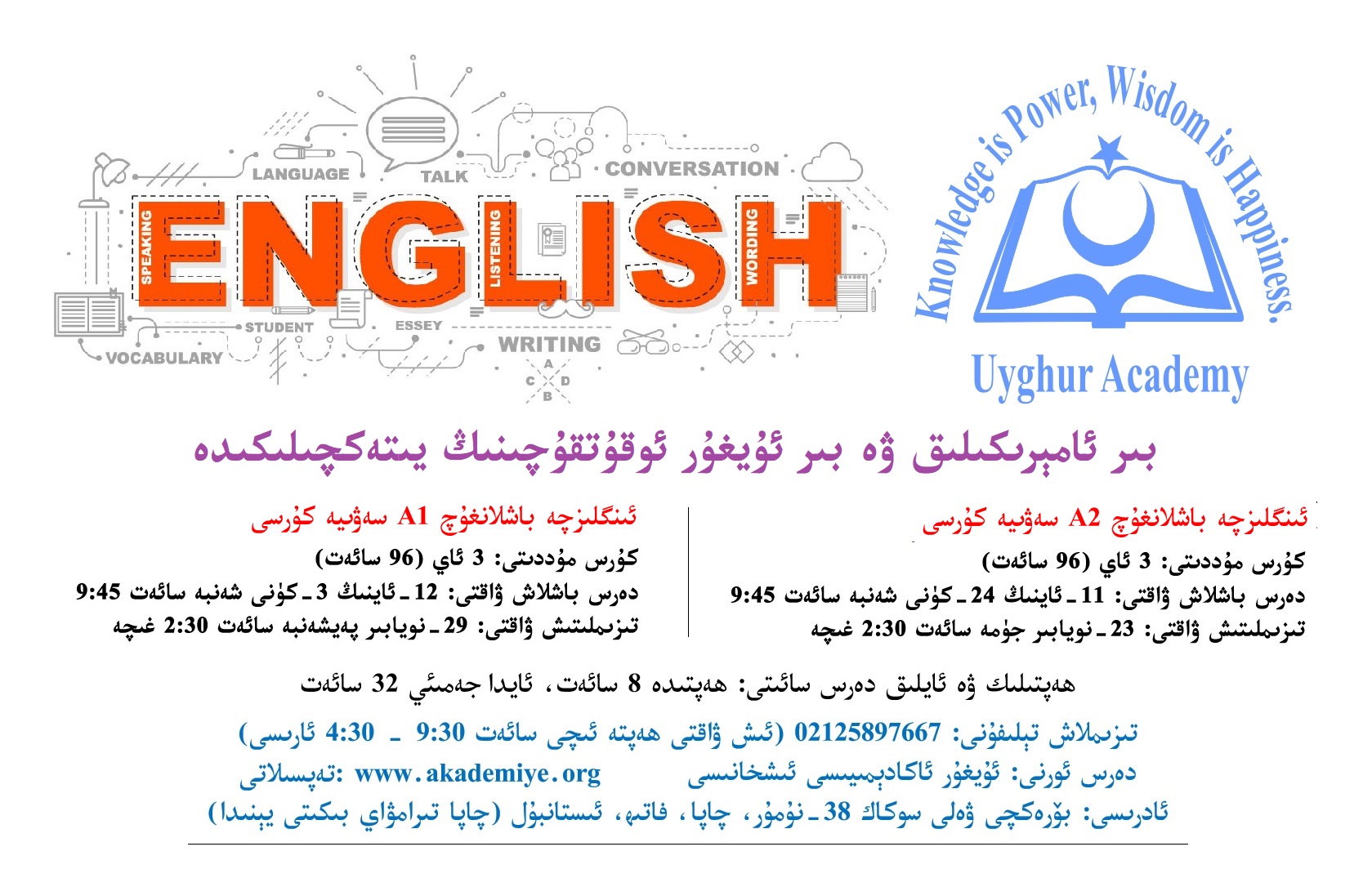 ئىنگلىزچە كۇرسىدا ئوقۇشنى خالىغان ئۇيغۇر ئوقۇغۇچىلارنىڭ دەرسكە كىرەلىشى ئۈچۈن 11-ئاينىڭ 23-كۈنى جۈمە چۈشتىن كېيىن سائەت 2:30 غىچە ئاكادېمىيەنىڭ چاپادىكى ئىشخانىسىغا بېرىپ، ئايلىق 100 لىرا ئوقۇش پۇلى بىلەن 50 لىرا كىتاب پۇلى بولۇپ جەمىئىي 150 لىرا تاپشۇرۇشى تەلەپ قىلىنىدۇ.