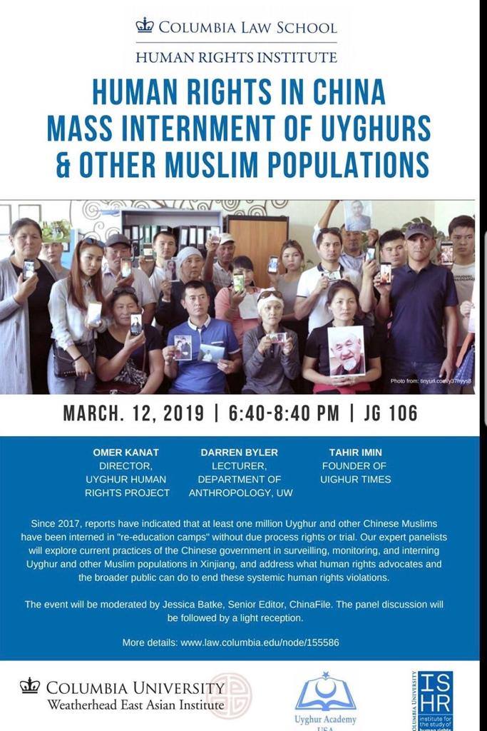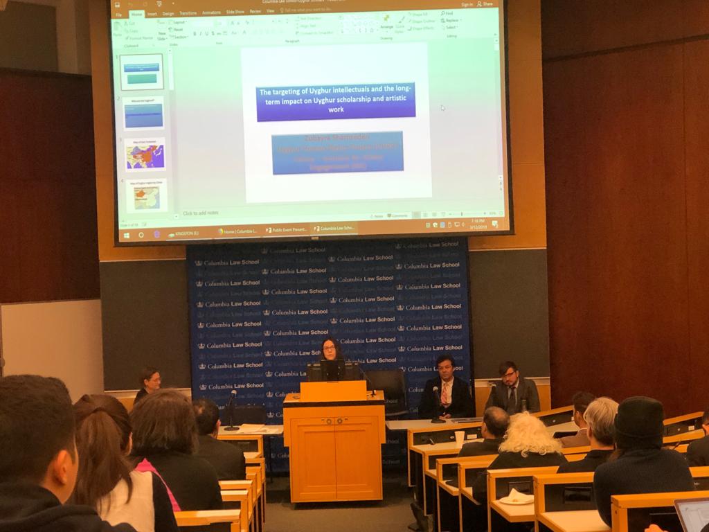 2019-يىلى 3-ئاينىڭ 12-كۈنى كەچتە نىيۇيورك شەھرىدىكى كولومبىيە ئۇنىۋېرسىتېتى قانۇن فاكۇلتىتىدە، ئامېرىكا ئۇيغۇر ئاكادېمىيىسى بىلەن كولومبىيە ئۇنىۋېرسىتېتى قانۇن فاكۇلتىتى، كولومبىيە ئۇنىۋېرسىتېتى كىشىلىك ھوقۇق ئىنىستىتۇتى ۋە كولومبىيە ئۇنىۋېرسىتېتى شەرقىي ئاسىيا ئىنىستىتۇتى قاتارلىق ئورگانلارنىڭ ھەمكارلىقىدا، «ئۇيغۇر ۋە باشقا مۇسۇلمانلارنىڭ كەڭ كۆلەملىك تۇتقۇن قىلىشى» توغرىسىدا ئىلمىي مۇھاكىمە يىغىنى ئۆتكۈزۈلدى.