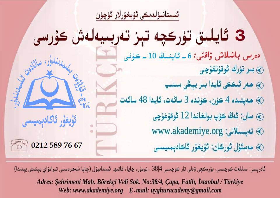 ئەسكەرتىش: تۈركچە كۇرسىغا تېخىچە تىزىملاتمىغان ئەمما ئوقۇشنى خالىغان ئۇيغۇر ئوقۇغۇچىلارنىڭ دەرسكە كىرەلىشى ئۈچۈن 5-ئاينىڭ 30-كۈنى پەيشەنبە چۈشتىن كېيىن سائەت 2:30 غىچە ئاكادېمىيەنىڭ چاپادىكى ئىشخانىسىغا بېرىپ، ئايلىق 100 لىرا ئوقۇش پۇلى ۋە 40 لىرا كىتاب پۇلى بولۇپ، 3 ئايلىق جەمىئىي 340 لىرا تاپشۇرۇشى تەلەپ قىلىنىدۇ. كۇرستا ئوقۇشقا تىزىملىتىدىغانلار ئاكادېمىيە ئىشخانىسىغا بېرىپ، كۇرسقا تىزىملىتىش جەدىۋېلىنى تولدۇرۇپ كىرەكلىك رەسمىيەتلەرنى بىجىرىشى كېرەك.