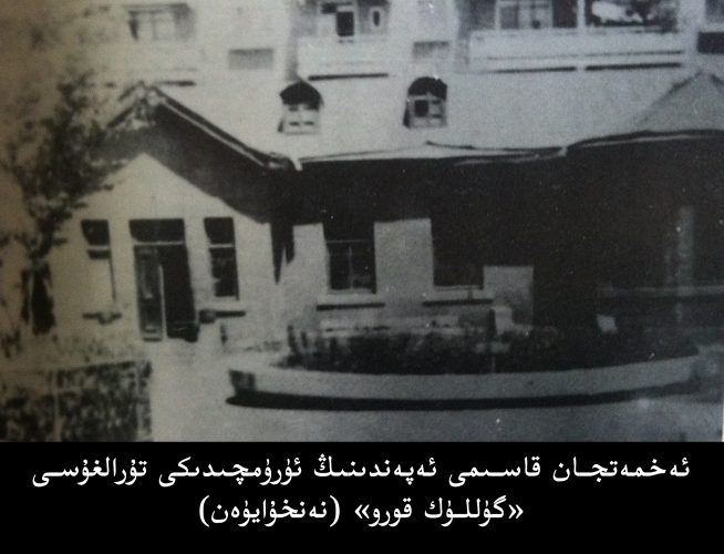 مەن تېخى ھازىرلا قوزغىلاڭ رەھبىرى ئەخمەتجاننى زىيارەت قىلدىم. ئۇ جۇغى كىچىكرەك، خۇشپېئىل بىر كىشى بولۇپ، يېشىل رەڭلىك دۇخاۋا دوپپا كىيگەن ۋە غەربچە قارا كاستومىنىڭ مەيدە يانچۇقىغا «پاركىر» ماركىلىق سىياھ قەلەم قىستۇرىۋالغان ئىدى. زىيارەت ئۈچۈن مەن تولىمۇ رەڭدار ۋە ئىللىق بىر ئۆيگە باشلاندىم. ئورۇندۇقلار ئاق رەڭلىك رەختلەر بىلەن قاپلانغان، ئىككى دېرىزە ئارىسىدا ئادەمبويى فىرانسۇزچە سىن ئەينەك قويۇلغان ئىدى. قارشى تەرەپتىكى تامغا كارىۋات ياپقۇچ چوڭلۇقىدىكى قىزىل رەڭلىك يېپەك بايراق ئېسىلغان بولۇپ، ئۈستىدە تەخمىنىمچە ئىلى قوزغىلىڭى ھەققىدىكى كۈلرەڭ خەتلەر ۋە قوزغىلاڭچىلارنىڭ دۆلەت گىربى (ئاي يۇلتۇز) چۈشۈرۈلگەن ئىدى.