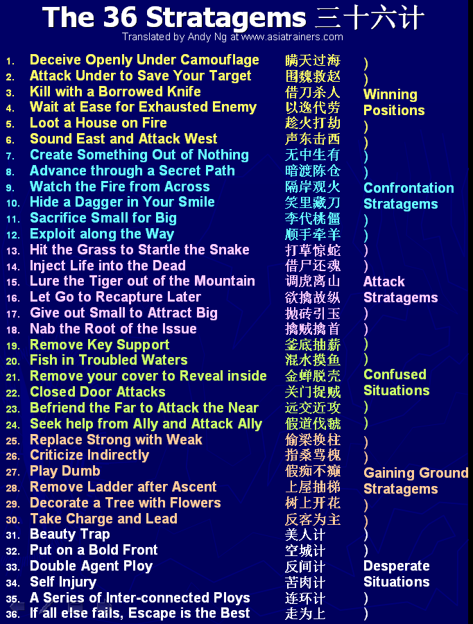 بۇ ھىيلىلەر دۈشمەنگە قارشى كۈچ سېلىشتۇرمىسىدا مۇتلەق ئۈستۈنلۈككە ئىگە ئەھۋالدا قوللىنىلىدۇ. ھازىرقى خىتاي دۆلىتىنىڭ يېقىنقى يىللاردىن بۇيان ئېلىپ بېرىۋاتقان سىياسەتلىرى مۇشۇ بىر تۈرلۈك ھىلىلەرنى ئاساس قىلىۋاتقان بولۇپ، بۇ خىتاينىڭ ئۆزىگە بولغان ئىشەنچىسىنىڭ ئاشقانلىقىدىن، ئۆزىنىڭ ئۈستۈنلۈك ئورنىنى ئۆزىنىڭ جەزىملەشتۈرىۋاتقانلىقىدىن دېرەك بېرىدۇ. بۇ تەدبىرلەرنى ئىشلىتىشنىڭ ئەڭ ئاساسلىق مەقسىتى كۈچلۈك ۋە غەلبە مۇقەررەر بولغان ئەھۋالدا، تىركىشىش جەريانىدىكى چىقىم ۋە زىياننى ئەڭ تۆۋەن دەرىجىگە چۈشۈرۈش مەقسەت قىلىنغان بولۇپ، بۇ نۇقتىدىن قارىغاندا، خىتاينىڭ بۇ تەدبىرلەرنى ئىشلىتىشى ئۇنىڭ ئۆزىنىڭ مۇتلەق غەلبە قىلىدىغانلىقىغا بولغان ئىشەنچىسىدىنمۇ دېرەك بېرىشى مۇمكىن.