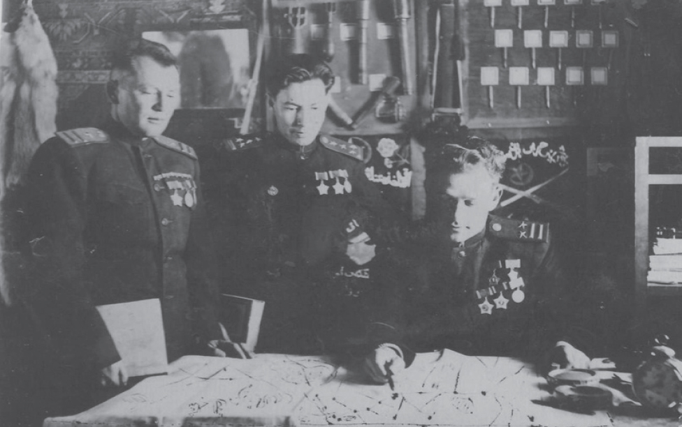 شەرقىي تۈركىستان مىللىي ئارمىيە باش قوماندانلىق شىتابى ئىچىدىن بىر كۆرۈنۈش، 1945-يىل، غۇلجا. (ئولتۇرغان كىشى پودپولكوۋنىك ئايتۇغان يۇنىچى)