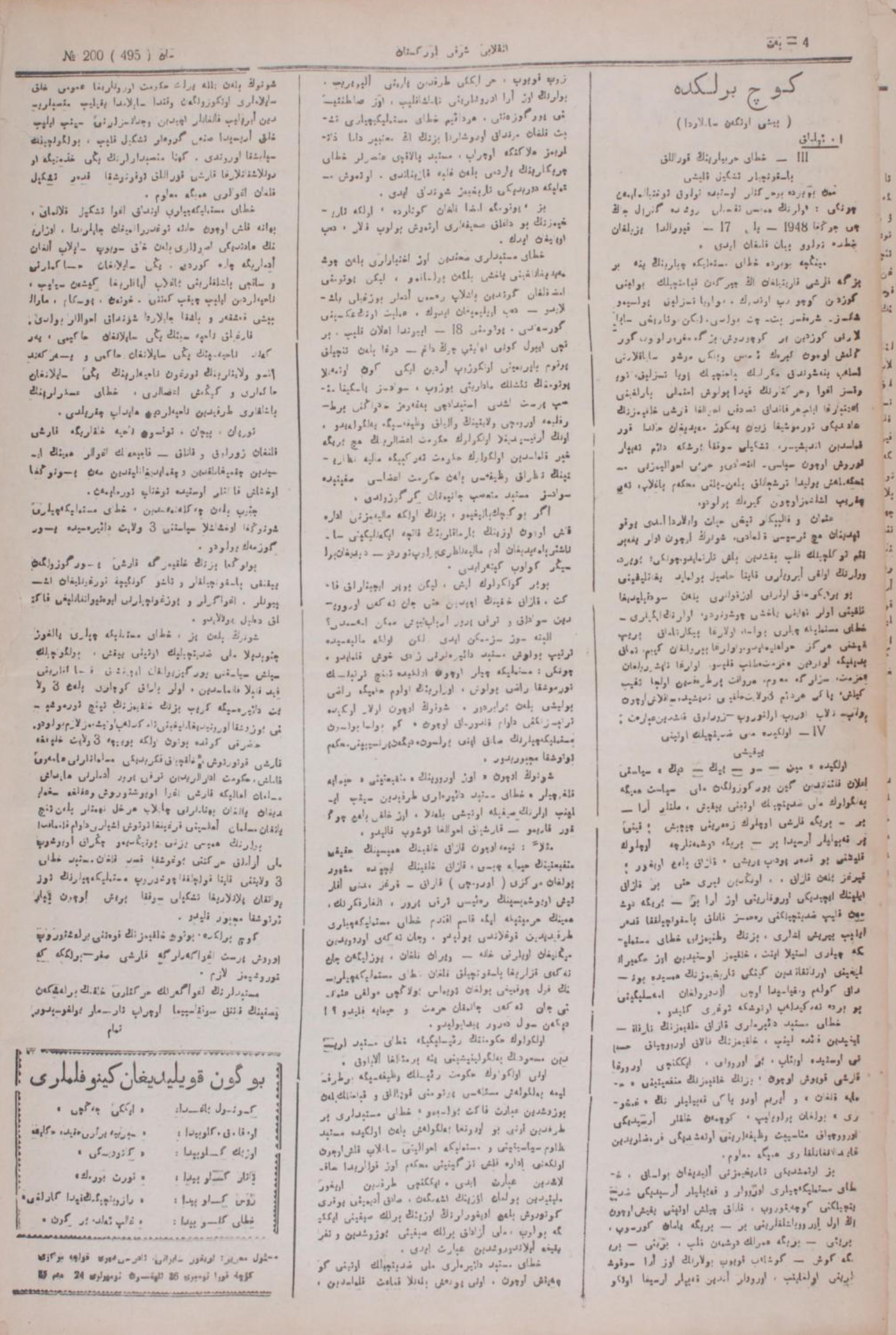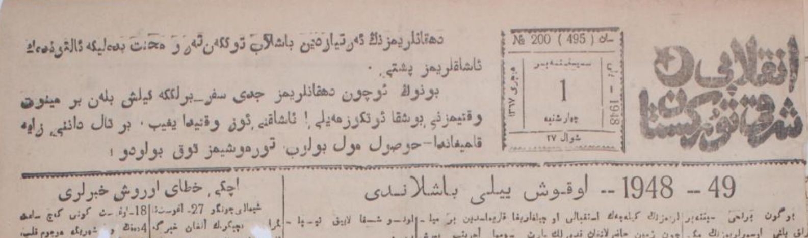 («ئىنقىلابىي شەرقىي تۈركىستان گېزىتى»نىڭ 1948-يىلى 1-سېنتەبىر چارشەنبە كۈنىدىكى 200-سانىغا بېسىلغان)