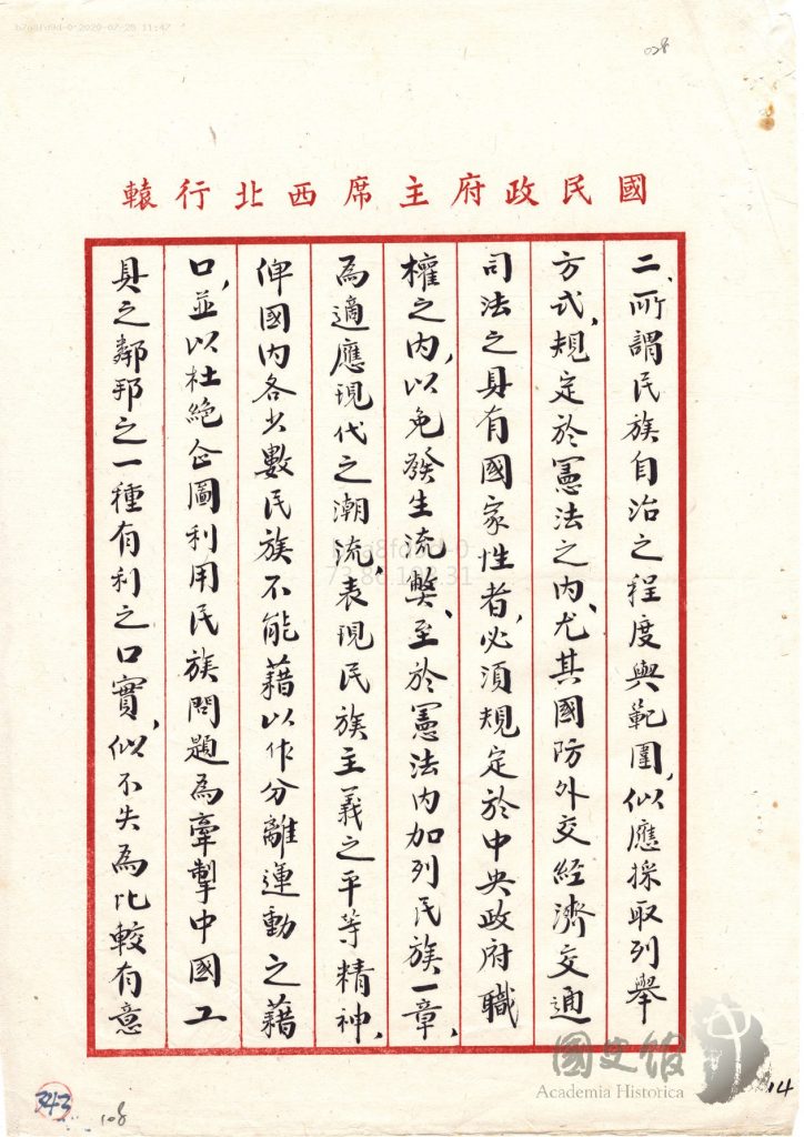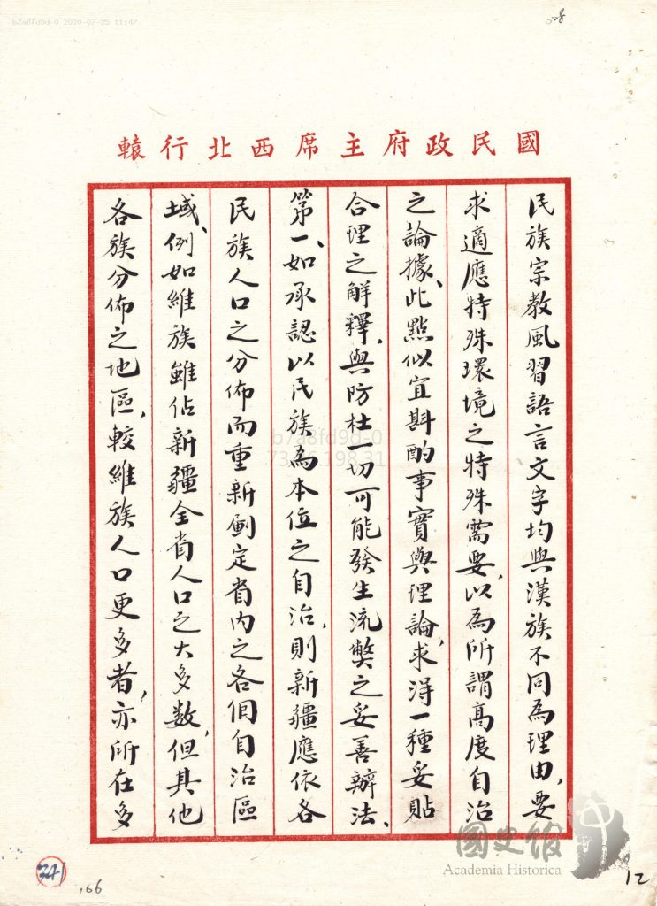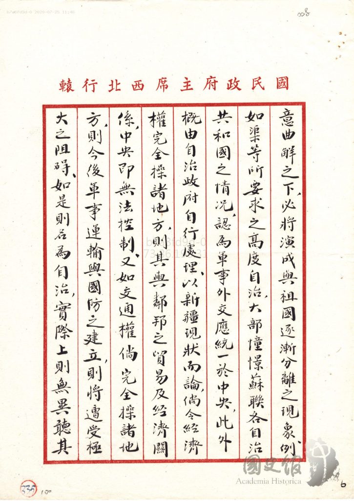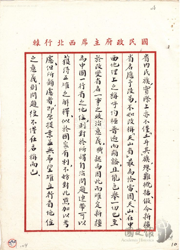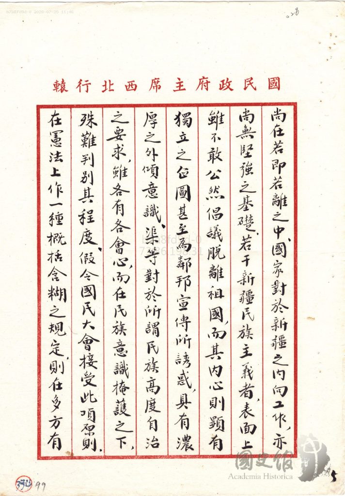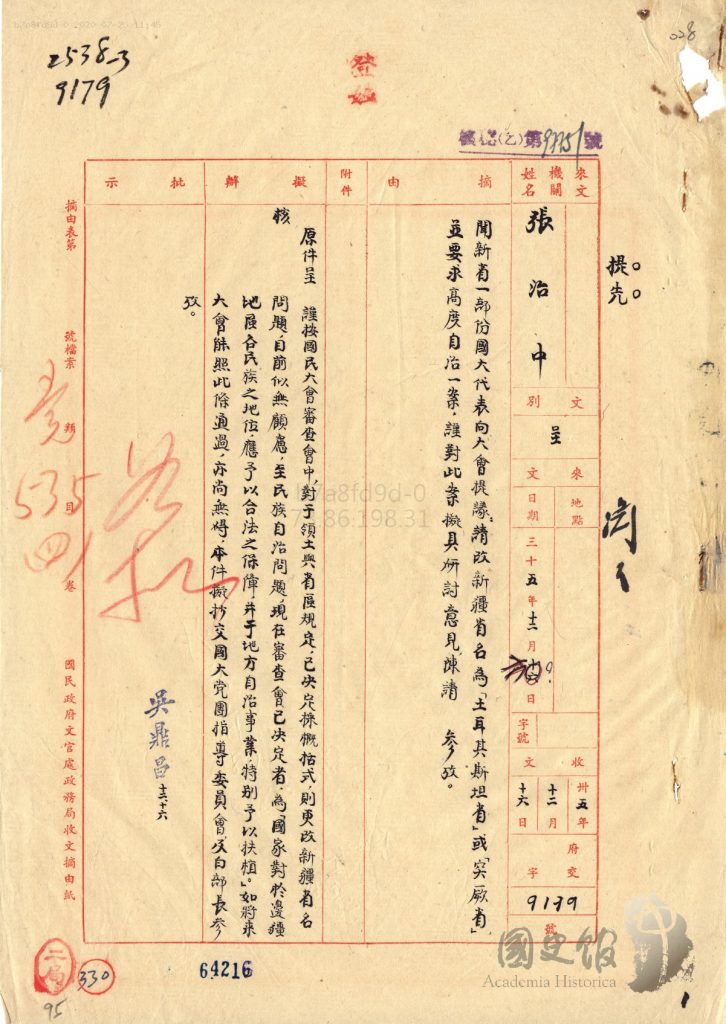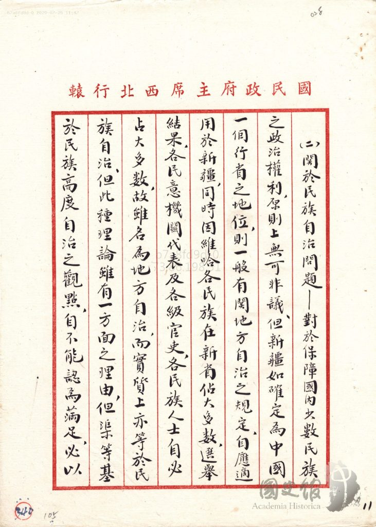 جاڭ جىجۇڭنىڭ شەرقىي تۈركىستانغا ئالىي مۇختارىيەت بەرمەسلىك ھەققىدە جياڭ جېشىغا يوللىغان دوكلاتى