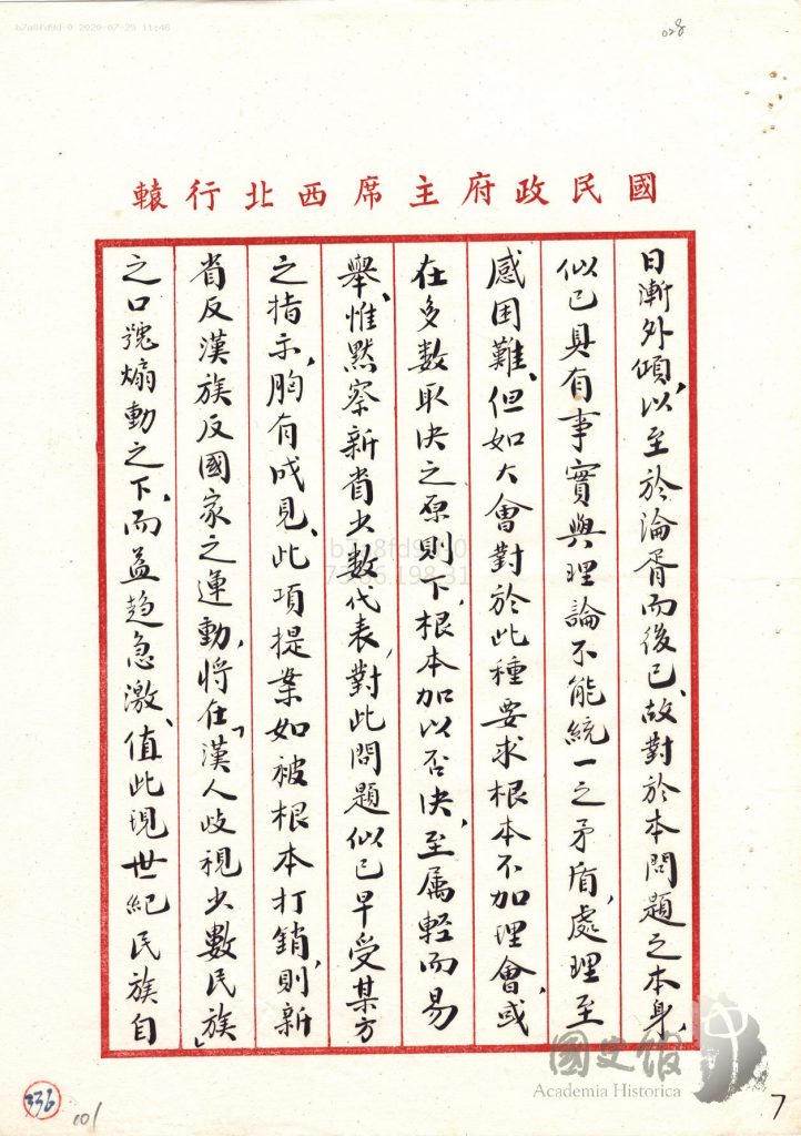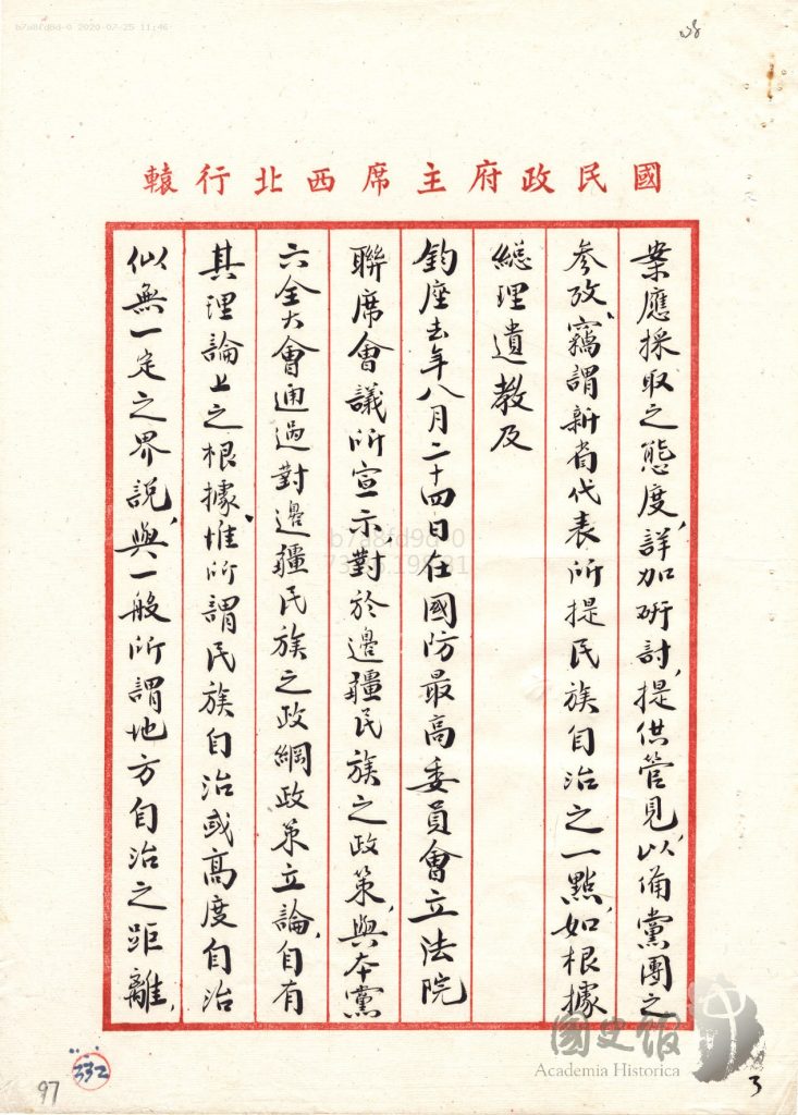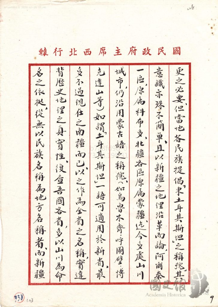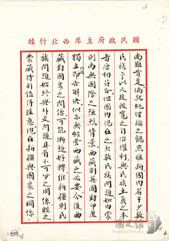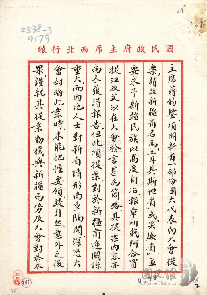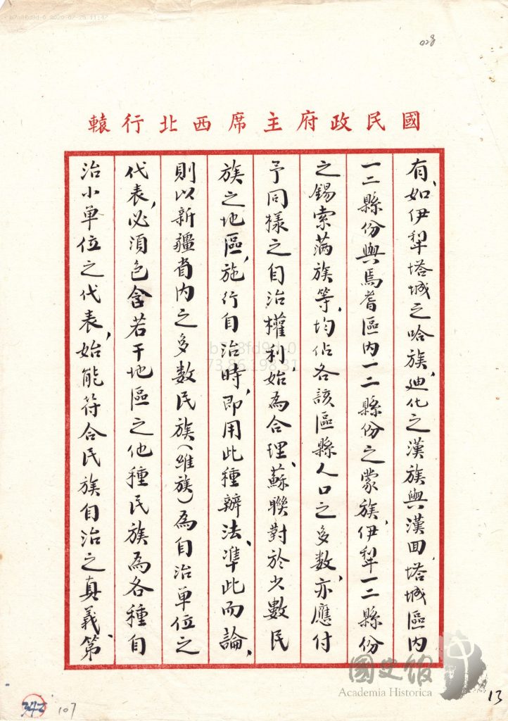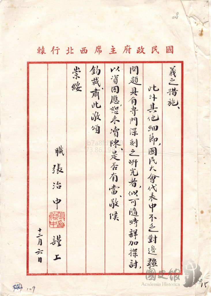 جاڭ جىجۇڭنىڭ شەرقىي تۈركىستانغا ئالىي مۇختارىيەت بەرمەسلىك ھەققىدە جياڭ جېشىغا يوللىغان دوكلاتى