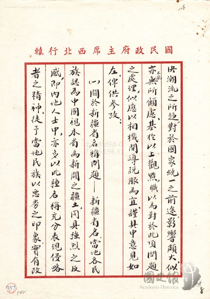 ئىلاۋە: ھۆرمەتلىك ئوقۇرمەن، مەزكۇر يازما 1946-يىلى 6-دېكابىر ئەينى چاغدىكى غەربىي شىمال مەمۇرىي مەھكىمىسىنىڭ مۇدىرى ۋە قوشۇمچە «شىنجاڭ» ئۆلكىسىنىڭ رەئىسى جاڭ جىجۇڭ تەرىپىدىن خىتاي گومىنداڭ ھاكىمىيىتى رەئىسى جياڭ جېشىغا يوللانغان دوكلات ئاساسىدا تەرجىمە قىلىنىپ تەييارلاندى. مەزكۇر دوكلات ئەخمەتجان قاسىمى باشچىلىقىدىكى شەرقىي تۈركىستان ۋەكىللىرى 1946-يىلى نويابىرنىڭ ئاخىرى نەنجىڭدا ئېچىلغان خىتاي ئاساسىي قانۇنى تۈزۈلىدىغان «خەلق ۋەكىللەر قۇرۇلتىيى»غا قاتنىشىۋاتقان مەزگىلدە يوللانغان بولۇپ، ئەخمەتجان قاسىمى باشچىلىقىدا قۇرۇلتايغا سۇنۇلغان شەرقىي تۈركىستاننىڭ تارىخىي نامىنى ئەسلىگە كەلتۈرۈش ۋە ئالىي مۇختارىيەت ھوقۇقىنى ئاساسىي قانۇنغا كىرگۈزۈپ رەسمىي تونۇش قاتارلىق ماددىلارنى ئۆز ئىچىگە ئالغان تەكلىپ لايىھەسىنى توسۇشنى مەقسەت قىلغان. مەزكۇر دوكلاتتا جاڭ جىجۇڭ گەرچە «شىنجاڭ» دېگەن لەنەتلىك ئىسىمنىڭ ئۆزگەرتىلىشكە تېگىشلىك ئىكەنلىكىنى ئېتىراپ قىلسىمۇ، ئۇنى خىتاي ئۆلكىلىرىنىڭ ئەنئەنەلىرى بويىچە ئۆزگەرتىشنى، شۇ ئارقىلىق شەرقىي تۈركىستاننىڭ خىتاي ئۆلكىسى ئىكەنلىكىدەك ئورنىنىڭ مۇستەھكەملىنىشىگە ئاساس سېلىشنى ئوچۇق ئېيتىدۇ. ئۇ يەنە شەرقىي تۈركىستانغا بىر خىتاي ئۆلكىسى قاتارىدا مۇئامىلە قىلىپ، باشقا خىتاي ئۆلكىلىرىگە بېرىلمەكچى بولغان ئادەتتىكى مۇختارىيەتنىلا تونۇشنى تەشەببۇس قىلىدۇ. شۇنداقلا ئەگەر مىللىي مۇختارىيەت ھوقۇقىنى چوقۇق تونۇشقا توغرا كەلسە، شەرقىي تۈركىستاندا باشقا يەرلىك مىللەتلەرنىڭ كىچىك مۇختارىيەتلىرىنى تەڭ قۇرۇشنى كۆرسىتىدۇ. خىتاي كومۇنىستلىرى 1955-يىلى ئاتالمىش «شىنجاڭ ئۇيغۇر ئاپتونۇم رايونى»نى تەسىس قىلغان چاغدا جاڭ جىجۇڭ مەزكۇر دوكلاتتا تىلغا ئالغان ئۇسۇلنى ئۆز ئەينى بويىچە قوللانغانلىقى ۋە «شىنجاڭ» دېگەن لەنەتلىك ئىسىمغا باشقىچە تەبىر بېرىشكە ئۇرۇنۇپ، يەنىلا ساقلاپ قالغانلىقى مۇستەملىكەچى گومىنداڭ ۋە خىتاي كومۇنىستلىرىنىڭ مىللىي مەسىلە، بولۇپمۇ شەرقىي تۈركىستان مەسىلىسىگە تۇتقان پوزىتسىيەسىنىڭ نەقەدەر ئوخشاش ۋە ئىزچىل ئىكەنلىكىنى كۆرسىتىپ تۇرىدۇ.