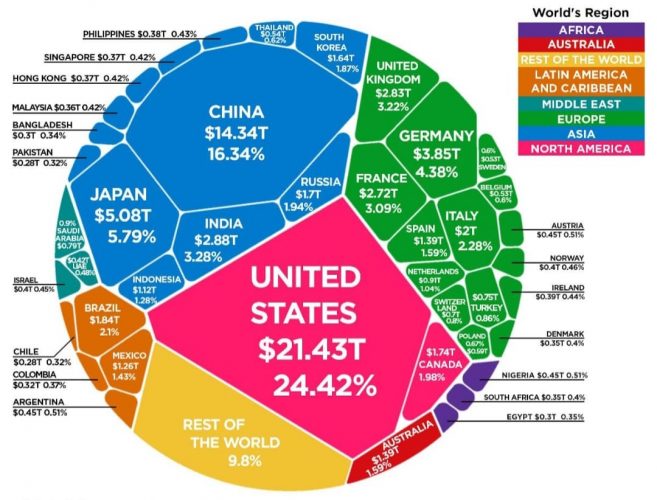 تۆۋەندە دۇنيا بانكىسى 2019-يىلى ئېلان قىلغان گىرافىكىدىن دۇنيادىكى دۆلەتلەرنىڭ ئىقتىسادى كۈچى ۋە دۇنيا بازىرىدا ئىگىلىگەن نىسبىتىگە قارىساق مەسىلىنى تېخىمۇ ياخشى چۈشىنەلەيمىز.