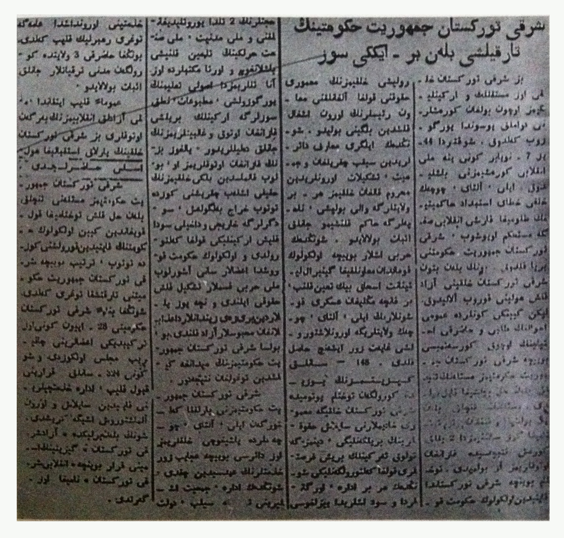 «ئازاد شەرقىي تۈركىستان گېزىتى»گە بېسىلغان ھۆكۈمەتنىڭ ئاخىرقى قارارى ھەققىدىكى «شەرقىي تۈركىستان جۇمھۇرىيەت ھۆكۈمىتىنىڭ تارقىلىشى بىلەن بىر-ئىككى سۆز» ناملىق باش ماقالە