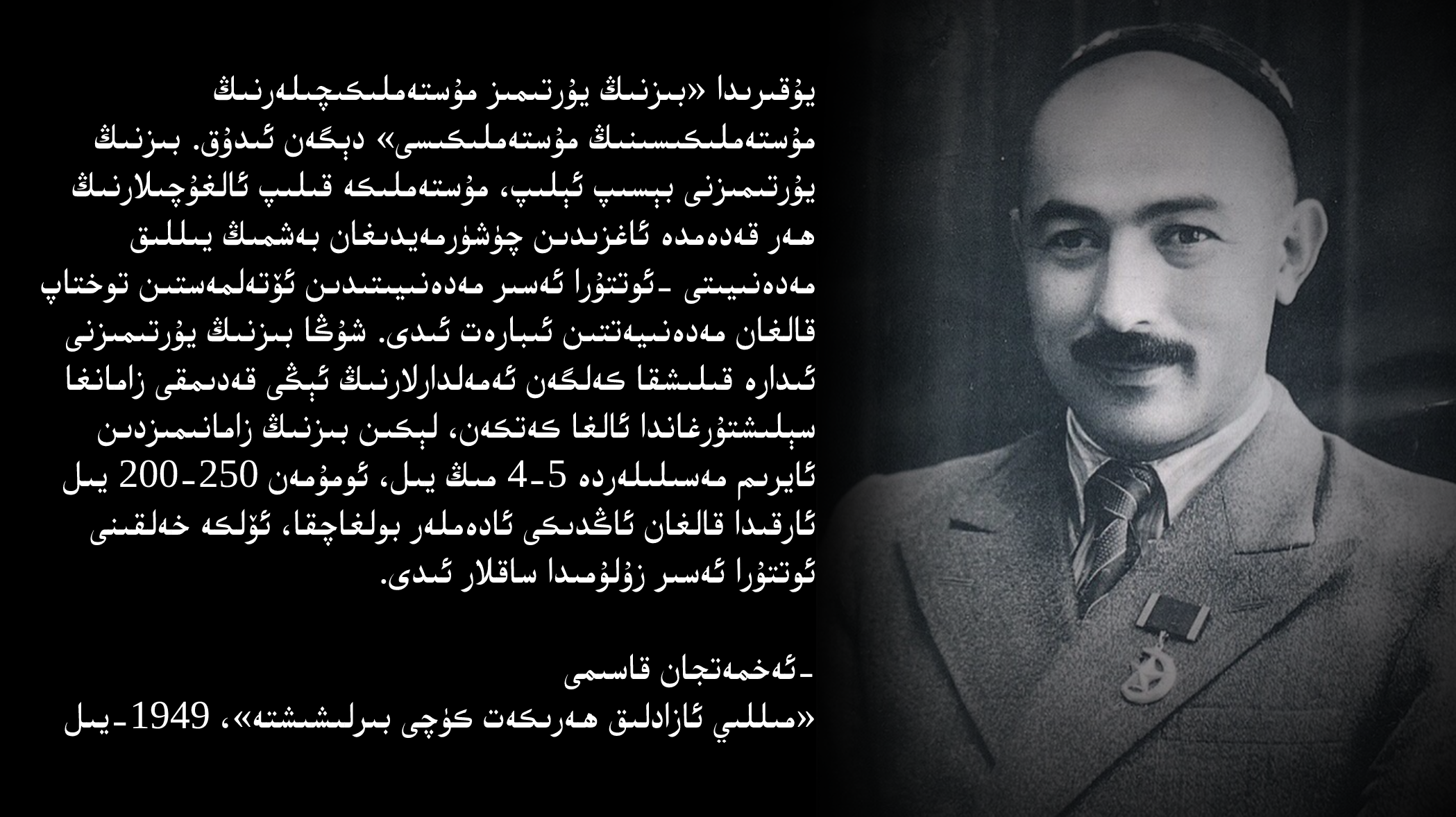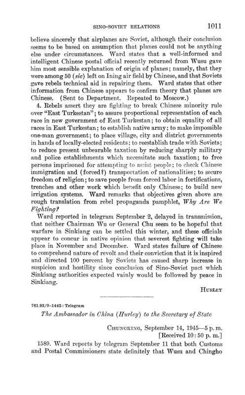 ئىلاۋە: ھۆرمەتلىك ئوقۇرمەن، مەزكۇر يازما ئامېرىكا دۆلەت ئىشلىرى مەھكىمىسى (تاشقىي ئىشلار مىنىستېرلىقى) ئارخىپلىرىدىكى 1944-يىلى پارتىلىغان شەرقىي تۈركىستان ئىنقىلابىغا ئائىت ھۈججەتلەردىن تەرجىمە قىلىنىپ تەييارلاندى. مەزكۇر ھۈججەت 1945-يىلى 13-سېنتەبىر كۈنى ئامېرىكانىڭ خىتايدا تۇرۇشلۇق باش ئەلچىسى پاترىك خىرلىي (Patrick Hurley) تەرىپىدىن ئامېرىكا دۆلەت ئىشلىرى كاتىبىغا يوللانغان بىر پارچە تېلىگرامما بولۇپ، شەرقىي تۈركىستان ئىنقىلابىغا قاتناشقۇچىلارنىڭ تەركىبى، ئىنقىلابنىڭ خارەكتېرى ۋە مەقسىتى ھەققىدە تۆت نۇقتا بويىچە ئۇچۇر بەرگەن. مەزكۇر تېلىگرامما ئەسلى ئامېرىكانىڭ ئۈرۈمچىدە تۇرۇشلۇق كونسۇلى روبېرت ۋارد (Robert Ward) نىڭ دوكلاتىغا ئاساسەن تەييارلانغان بولۇپ، ۋارد ئەپەندى خىتاي دائىرەلىرىنىڭ ئىنقىلابنىڭ ماھىيىتىنى بۇرمىلاپ تەشۋىق قىلىۋاتقانلىقىنى تەنقىدلىگەن ۋە ئىنقىلابچىلارنىڭ ھەقىقىي مەقسەتلىرى ھەققىدە ئىجابىي باھالار بەرگەن. مەزكۇر تېلىگرامما يوللانغان چاغدا گەرچە خىتاي-سوۋېت دوستلۇق كېلىشىمى ئىمزالىنىپ بولغان بولسىمۇ، تېنچلىق سۆھبىتى ھەققىدە تېخى گەپ تېشىلمىگەن بولۇپ، خىتاي دائىرەلىرىنىڭ شەرقىي تۈركىستان مىللىي ئارمىيەسىنى 1945-يىلىنىڭ ئاخىرقى ئايلىرىدا تېخىمۇ شىددەتلىك ھۇجۇملارنى قوزغىشىنى مۆلچەرلەپ تۇرغانلىقى تېلىگراممادا ئېنىق كۆرسىتىلىدۇ. بۇ تېلىگرامما يوللىنىپ بىر قانچە كۈندىن كېيىن، سوۋېت ئىتتىپاقىنىڭ رەسمىي ئارىچى بولۇشى تەلەپ قىلىنىدۇ ۋە سوۋېت ھۆكۈمىتى شەرقىي تۈركىستان جۇمھۇرىيىتى ھۆكۈمىتىدىن بىسوراق خىتاي دائىرەلىرىگە «قوزغىلاڭچىلارنىڭ خىتايدىن ئايرىلىش نىيىتى يوق» دېگەن مەنىدە ۋەدە بېرىپ، ئەسلەتمە تاپشۇرىدۇ. شۇ يىل ئۆكتەبىردە ۋەزىيەت بىردىنلا ئۆزگىرىپ, تېنچلىق سۆھبىتى ئۈرۈمچىدە باشلىنىدۇ.