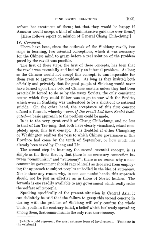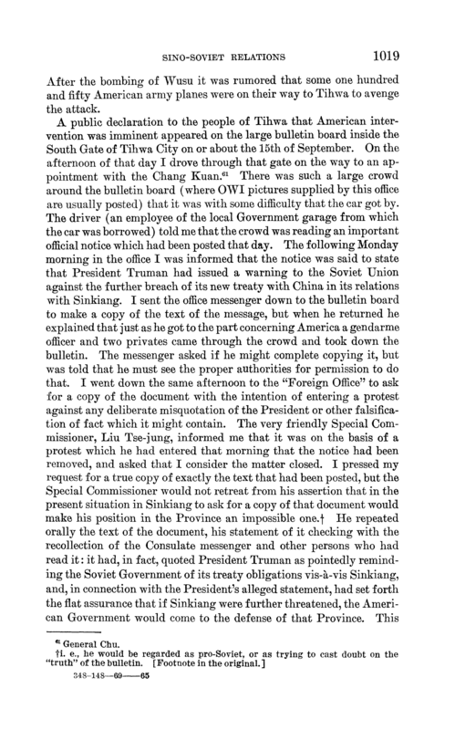 «خىتاي-سوۋېت كېلىشىمى» ئىمزالىنىپ 10 كۈنلەر ئۆتكەندە، ئۇنى تەبرىكلەش يۈزىسىدىن ئۆتكۈزۈلگەن ھۆكۈمەت زىياپىتىدە مېنىڭ قېشىمدىكى ئورۇندا ئولتۇرغان شىنجاڭ ئۆلكىسىنىڭ رەئىسى (ۋۇ جۇڭشىن) ماڭا (ئۇ ئالدى بىلەن ماڭا خىتاي تىلىدا سۆزلىدى – ئاندىن بىر تەرجىماننىڭ ئۇنىڭ سۆزلىرىنى ماڭا ئېنگىلىزچىگە تەرجىمە قىلىپ بېرىشىنى تەلەپ قىلدى) مۇنۇلارنى بايان قىلدى: