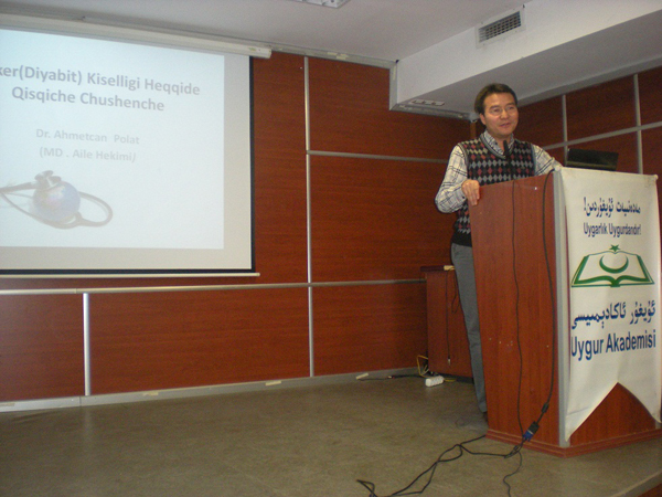 ئەخمەتجان ئەپەندى ئالدى بىلەن شىكەر كىسەللىگىىنىڭ قاندىكى شىكەر (گلىكوز) مىقدارىنىڭ نورمالدىن يۇقىرى بولىشى بىلەن ئۆزىنى كۆرسەتكەن، ئاستا خاراكتىرلىك ۋە ئىنسان بەدىنىنىڭ ھەممە ئەزالىرىغا تەسىر كۆرسىتىدىغان كىسەللىك ئىكەنلىگىنى، ئاچلىق قان شىكىرى (8 سائەت ئاچلىق) >=126 mg/dl ۋە توقلۇق قان شىكىرى (تاماقتىن 2 سائەت كەيىنكى) >=200 mg/dl بولغاندا شېكەر كىسەللىگى (دىيابىت) دەپ دىئاگنوز قويۇلىدىغانلىقىنى چۈشەندۈردى. دىيابىت كىسەللىگىنىڭ ئالامەتلىرىنىڭ ئاساسلىق كىچىك تەرەتكە كۆپ چىقىش، كۆپ ئۇسساش، كۆپ يىمەك يىيىش ئەمما سەمىرىمەسلىك، ئاغزى قۇرۇش، ھالسىزلىق ۋە تىز ھېرىپ قېلىش، كىچىدە كۆپ كىچىك تەرەت قىلىش قاتارلىقلار ئىكەنلىكىنى سۆزلەپ، ئەگەشكۇچى كىسەللىكلەر يۈرەك-قان تۇمۇر كىسەللىكلىرى، بۆرەك كېسەللىكلىرى ۋە كۆز كېسەللىكلىرىنى كەلتۈرۈپ چىقىرىدىغانلىقىنى ئوتتۇرىغا قويدى. ئاخىرىدا دىيابىت كىسەل بىمارلىرىنىڭ كۈندىلىك يىمەك-ئىچمەكتە پەرھىز تۇتۇشى، ياغدا قىزارتىلغان يىمەكلىكلەردىن كۆپرەك ھوردا پىشۇرۇلغان يېمەكلىكلەرنى يىيىشى، ھەركۈنى پىلانلىق چىنىقىشى، دورىنى ۋاقتىدا ئىچىشى، دوختۇرغا بېرىپ قان شىكىرى ۋە كۆزىنى تەكشۈرتۈپ تۇرۇشى ۋە پۇت تازىلىقىغا ئالاھىدە دىققەت قىلىشى كېرەكلىكىنى سۆزلەپ لىكسىيەسىنى ئاخىرلاشتۇردى. ساغلاملىق ھەر زامان ئىنسانلارنىڭ ئەڭ كۆڭۈل بۆلگەن تېمىسى بولغاچقا، بۇ لېكسىيىدىن كېيىنمۇ يىغىن ئەھلى بەس-بەستە سۇئال سوراپ كەيپىياتنى خېلى يۇقىرى كۆتۈردى.
