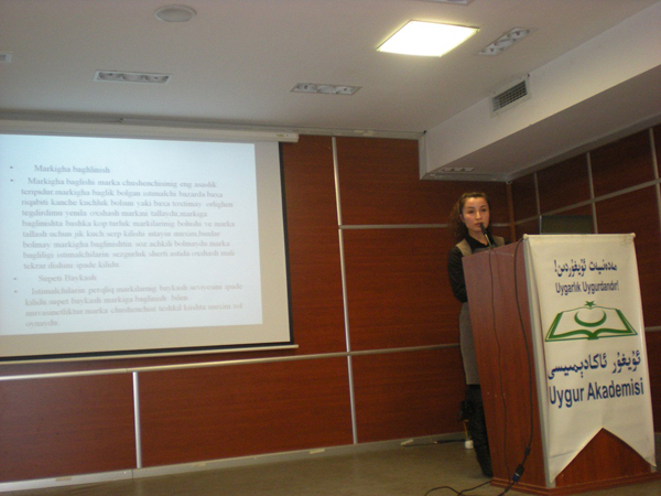 كەينىدىن ساكاريا ئۇنىۋېرسىتىتىنىڭ بازار ئىگىلىكى پەنلىرى بويىچە ماگېستىرى بۇئايشەم غوپۇر«تېلىۋوزور ئېلانلىرىنىڭ ئىستىمالچىلارنىڭ ماركا پەرقلەندۈرۈشىگە بولغان تەسىرى» دېگەن تېمىدا نۇتۇق بەردى.