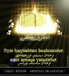 «ئەلىق. لام. را. (بۇ قۇرئان شۇنداق)كىتابتۇركى، (ئى مۇھەممەد!) ئۇنى ساڭا كىشىلەرنى پەرۋەردىگارىنىڭ ئىزنى بىلەن قاراڭغۇلۇقتىن (يەنى كۇفرىدىن) يورۇقلۇققا(يەنى ئىمانغا) چىقىرىشىڭ ئۈچۈن، غالىب، (ھەممە تىللاردا) مەدھىيىلەنگەن ئاللاھنىڭ يولىغا (باشلىشىڭ ئۈچۈن) نازىل قىلدۇق.» سۈرە ئىبراھىم 1-ئايەت