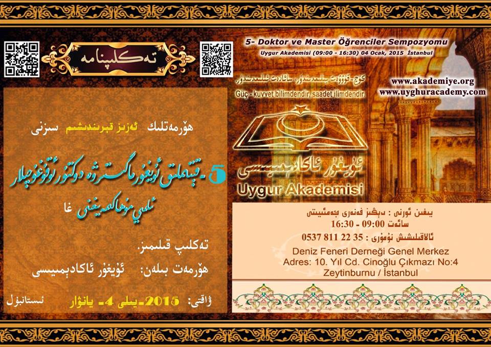 2015 – يىلى 4 – يانۋاردا ئۇيغۇر ئاكادېمىيسى ئۇيۇشتۇرغان 5 – قېتىملىق ئۇيغۇر ماگىستىر – دوكتۇر ئوقۇغۇچىلار ئىلمىي مۇھاكىمە يىغىنى، ئىستانبۇل شەھرى زەيتىنبۇرنى رايونىغا جايلاشقان دېڭىز فەنەرى جەمىئىيتى يىغىن زالىدا غەلبىلىك ئۆتكۈزۈلدى.