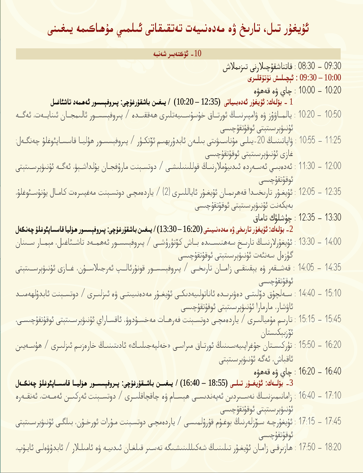 ئۇيغۇر ئاكادېمىيىسى بۇ ئىلمىي مۇھاكىمە يىغىنىنىڭ ئىلگىرىكىدىنمۇ يوقىرى سۈپەتلىك، پىلانلىق ۋە تەرتىپلىك ئېلىپ بېرىلىشى ئۈچۈن تىرىشچانلىق كۆرسەتمەكتە. يىغىن كۈنتەرتىپى تۆۋەنكىدەك:
