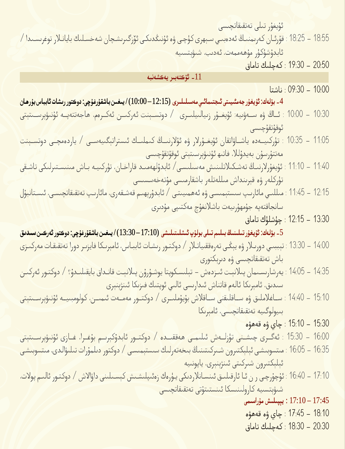 ئۇيغۇر ئاكادېمىيىسى 7 – نۆۋەتلىك ئۇيغۇر پەن – تەتقىقاتچى، ئەدىب ۋە مۇتەخەسىسلەر «ئۇيغۇر تىل، تارىخ ۋە مەدەنىيەت تەتقىقاتى» ئىلمىي مۇھاكىمە يىغىنى كۈنتەرتىپى