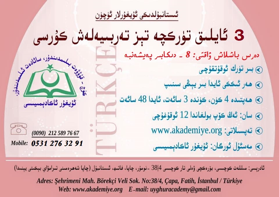 ئۇيغۇر ئاكادېمىيسىى ئىستانبۇلغا يېڭى كەلگەن ئۇيغۇرلارنىڭ ئەمەلىي تىل ئېھتىياجى ۋە تەلىپىگە ئاساسەن قەرەللىك ھالدا ئۈچ ئايلىق تۈركچە تىز تەربىيىلەش كۇرسى داۋاملىق ئېچىپ كېلىۋاتىدۇ.
