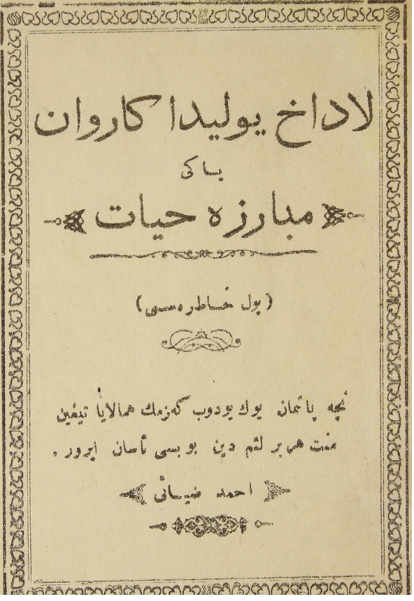ئەھمەت زىيائى ئەپەندىنىڭ 1946-يىلى نەشر قىلىنغان «لاداق يولىدا كارۋان» ناملىق ئەسىرىنىڭ مۇقاۋىسى.