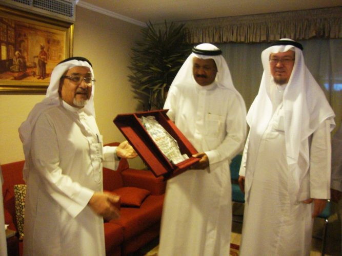 | رەسىم: سەئۇدى ئەرەبىستاندىكى «دۇنيا ئىسلام ئەللىرى ئىتتىپاقى» تەشكىلاتىنىڭ قۇرۇلتاي ئىشلىرى مۇدىرى رەھمەتۇللا ئىنايەتۇللا(سولدا)، سالام شىركىتىنىڭ لىدېرى ئەمىن ئابدۇلغەفۇر(ئوڭدا)، سەئۇدى رادىئوسىنىڭ مۇدىرى ھۈسەيىن ئەھمەد دەغرىرى(ئوتتۇرىدا)گە سەئۇدى ئەرەبىستان رادىئوسى ئۇيغۇر بۆلۈمىنىڭ تەشەككۈرنامىسىنى تەقدىم قىلماقتا. 2014-يىلى 22-فېۋرال. |