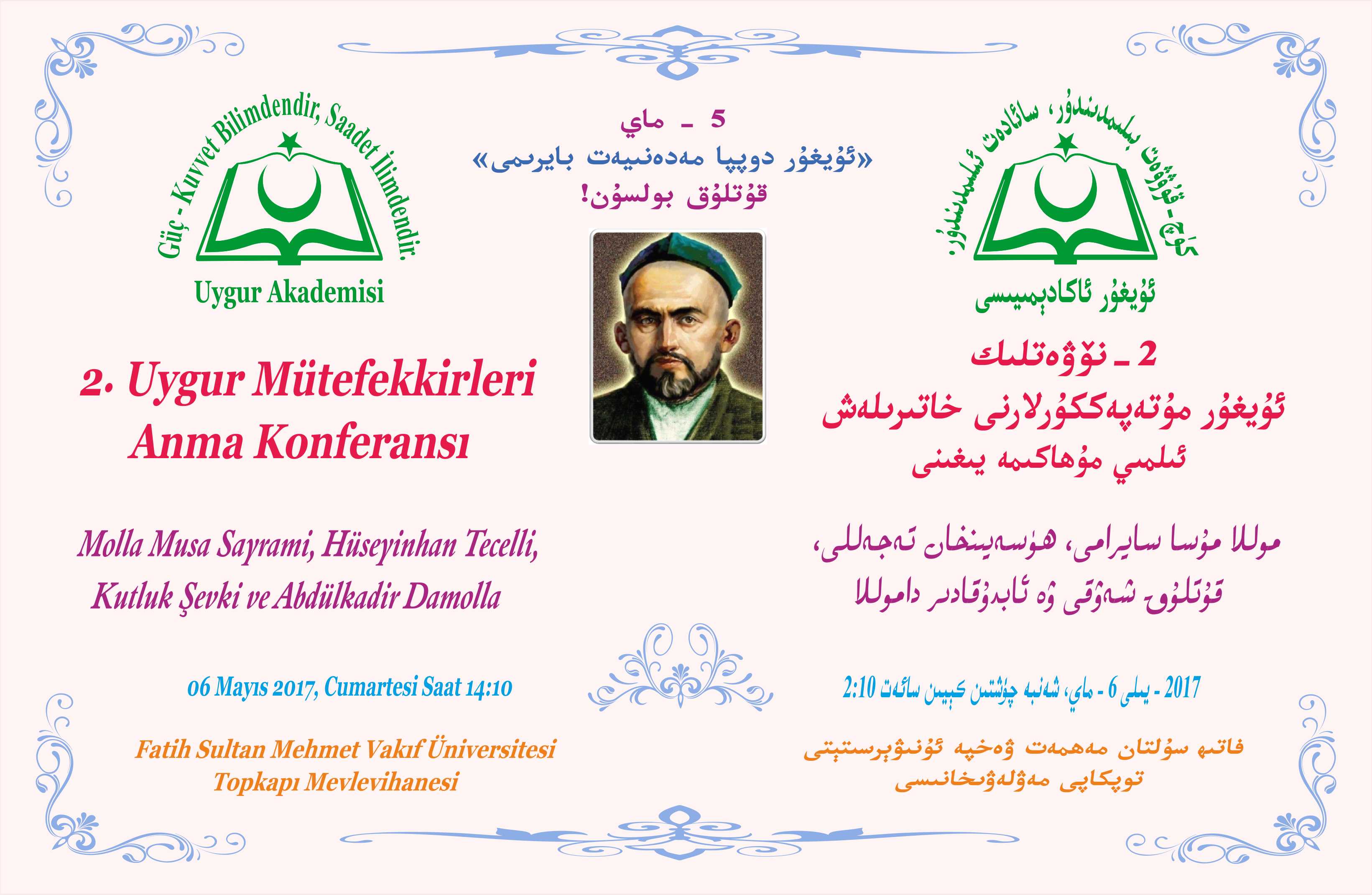 2017- يىلى موللا مۇسا سايرامى (1917-1836) ۋاپاتىنىڭ 100- يىلى، ھۈسەيىنخان تەجەللى (1927-1848) ۋاپاتىنىڭ 90- يىلى، قۇتلۇق شەۋقى (1937-1876) ۋاپاتىنىڭ 80- يىلى ۋە ئابدۇقادىر داموللا (1924-1862) تۇغۇلغانلىقىنىڭ 155- يىلى مۇناسىۋىتى بىلەن بۇ تارىخى شەخىسلىرىمىزنى يېقىندىن تونۇپ چىقىش ۋە ئۇلارنىڭ ئىش – ئىزلىرىدىن ئىلھام ئېلىش مەقسىتىدە، بۇ يىل 6- ماي شەنبە كۈنى چۈشتىن كېيىن، 2 – قېتىملىق «ئۇيغۇر مۇتەپەككۇرلارنى خاتىرلەش ئىلمىي مۇھاكىمە يىغىنى» ئۆتكۈزۈش قارار قىلىندى.