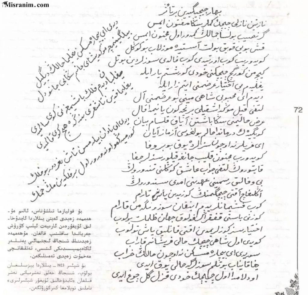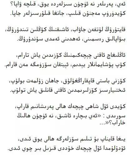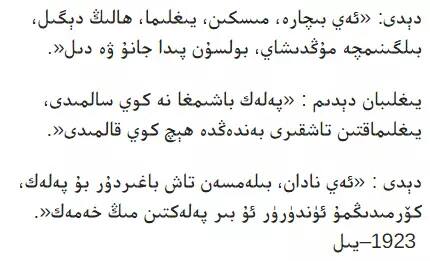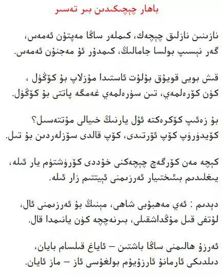 ئابدۇخالىق ئۇيغۇرنىڭ 1923-يىلدىكى قوليازمىسى يوللىغۇچى: ئاكادېمىيە ۋاقتى: ئاپرېل 13, 2017 ئورنى: ئەدەبىيات گۈلزارى ئۆت يۈرەك ئۇيغۇر شائىرى ئابدۇخالىق ئۇيغۇرنىڭ 1923 – يىلىدا ئۆز قولى بىلەن يازغان «باھار چېچىكىدىن بىر تەسىر» ناملىق شېئىرىنىڭ قوليازمىسى Facebook Share on X LinkedIn WhatsApp Email Copy Link Tweet Share
