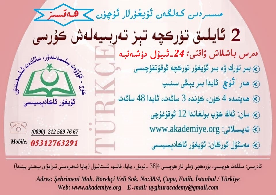 تۈركچە كۇرسىغا تېخىچە تىزىملاتمىغان ئەمما ئوقۇشنى خالىغان ئۇيغۇر ئوقۇغۇچىلارنىڭ دەرسكە كىرەلىشى ئۈچۈن يۈسۈپ پاشادىكى مەمتىلى مەمتىمىننىڭ ئىشخانىسىغا بېرىپ، تىزىملاش ھەققى بىلەن كىتاب پۇلىنى تاپشۇرۇشى تەلەپ قىلىنىدۇ. (مەمتىلى مەمتىمىن يانفۇن: 05312763291، دىققەت: ئىش ۋاقتى سىرتىدا كەچلىرى ۋە يەكشەنبە كۈنى كۇرس ھەققىدە تېلىفۇن قوبۇل قىلىنمايدۇ.)