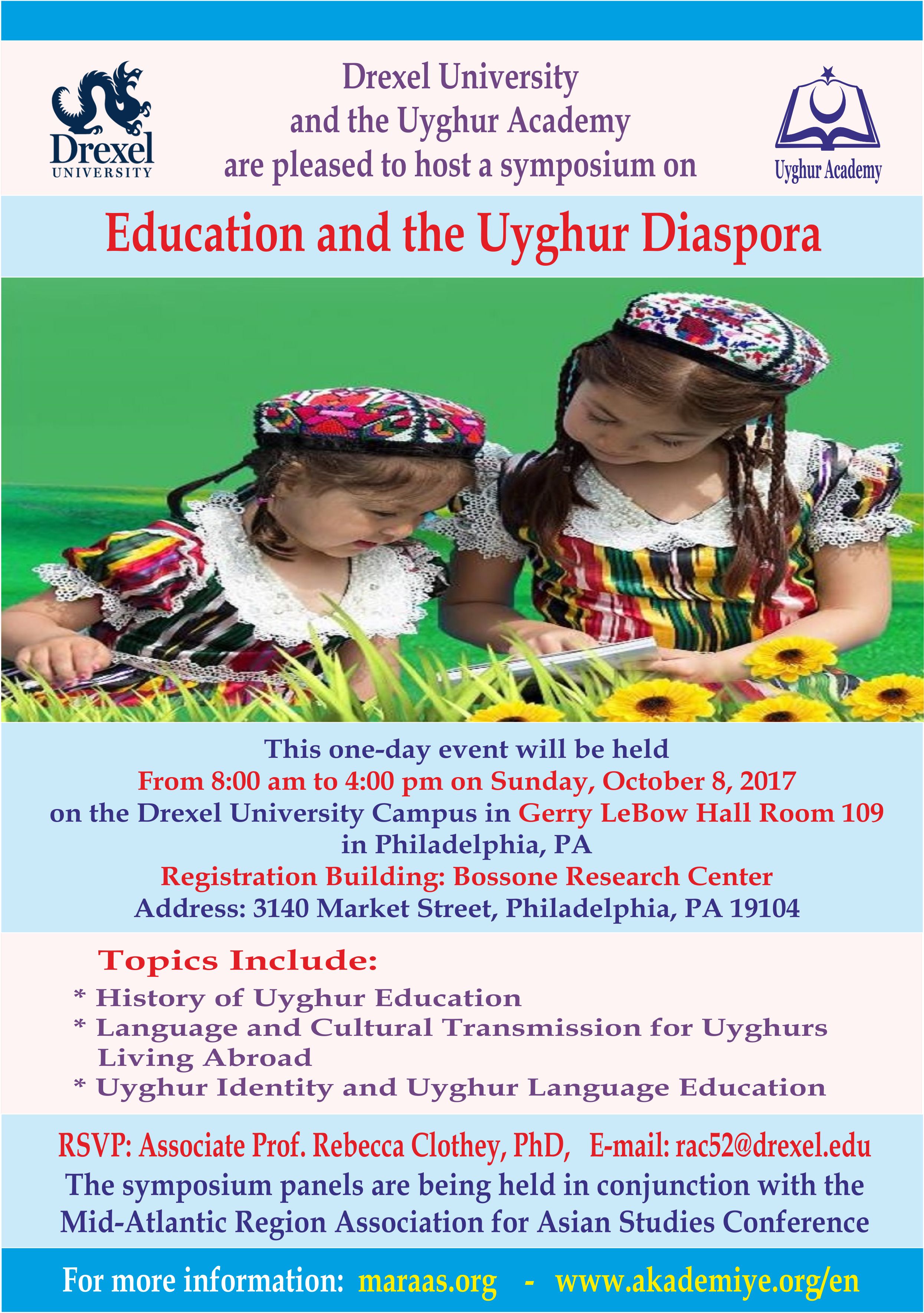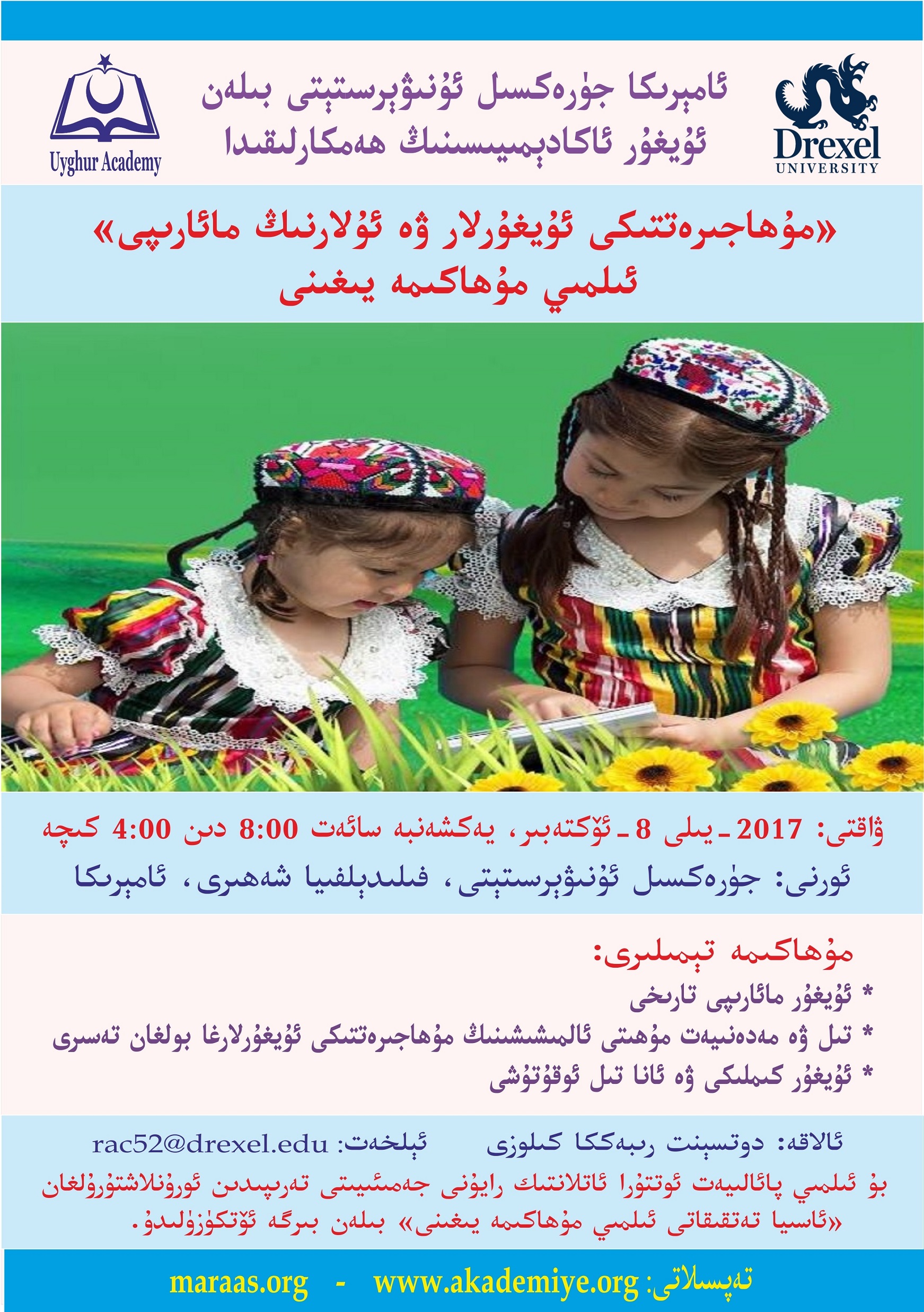 ئۇيغۇر ئاكادېمىيىسى بۇ قېتىم ئامېرىكىدىكى جۈرەكسىل ئۇنىۋېرسىتېتى (Drexel University) بىلەن ھەمكارلىشىپ، 2017-يىلى 8-ئۆكتەبىر يەكشەنبە كۈنى ئەتىگەن سائەت 8:00 دىن چۈشتىن كېيىن سائەت 4:00 كىچە ئامېرىكانىڭ فىلىدېلفىيا شەھىرىدىكى جۈرەكسىل ئۇنىۋېرسىتېتىدا «مۇھاجىرەتتىكى ئۇيغۇرلار ۋە ئۇلارنىڭ مائارىپى» ئىلمىي مۇھاكىمە يىغىنى ئۆتكۈزۈلىدۇ.