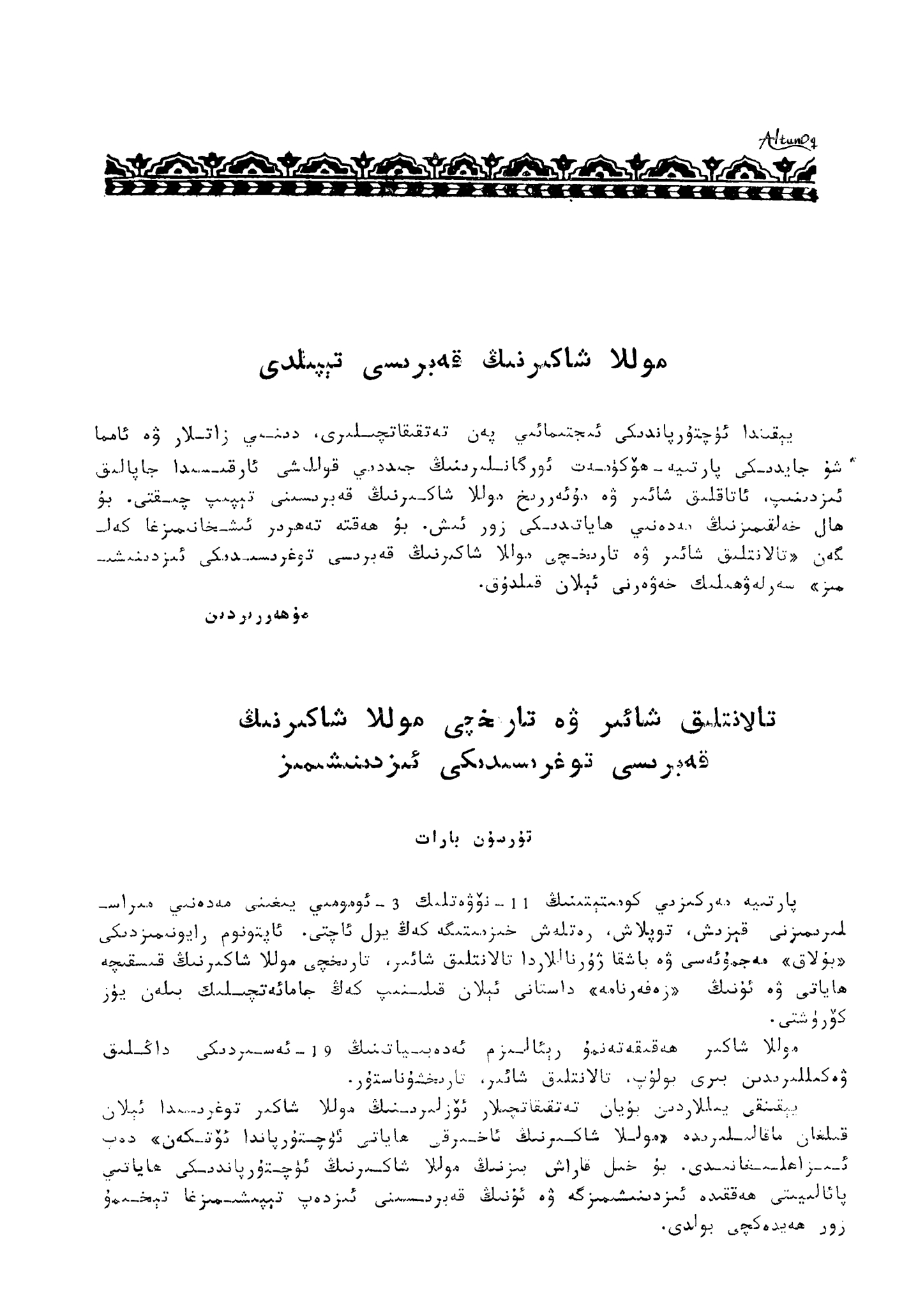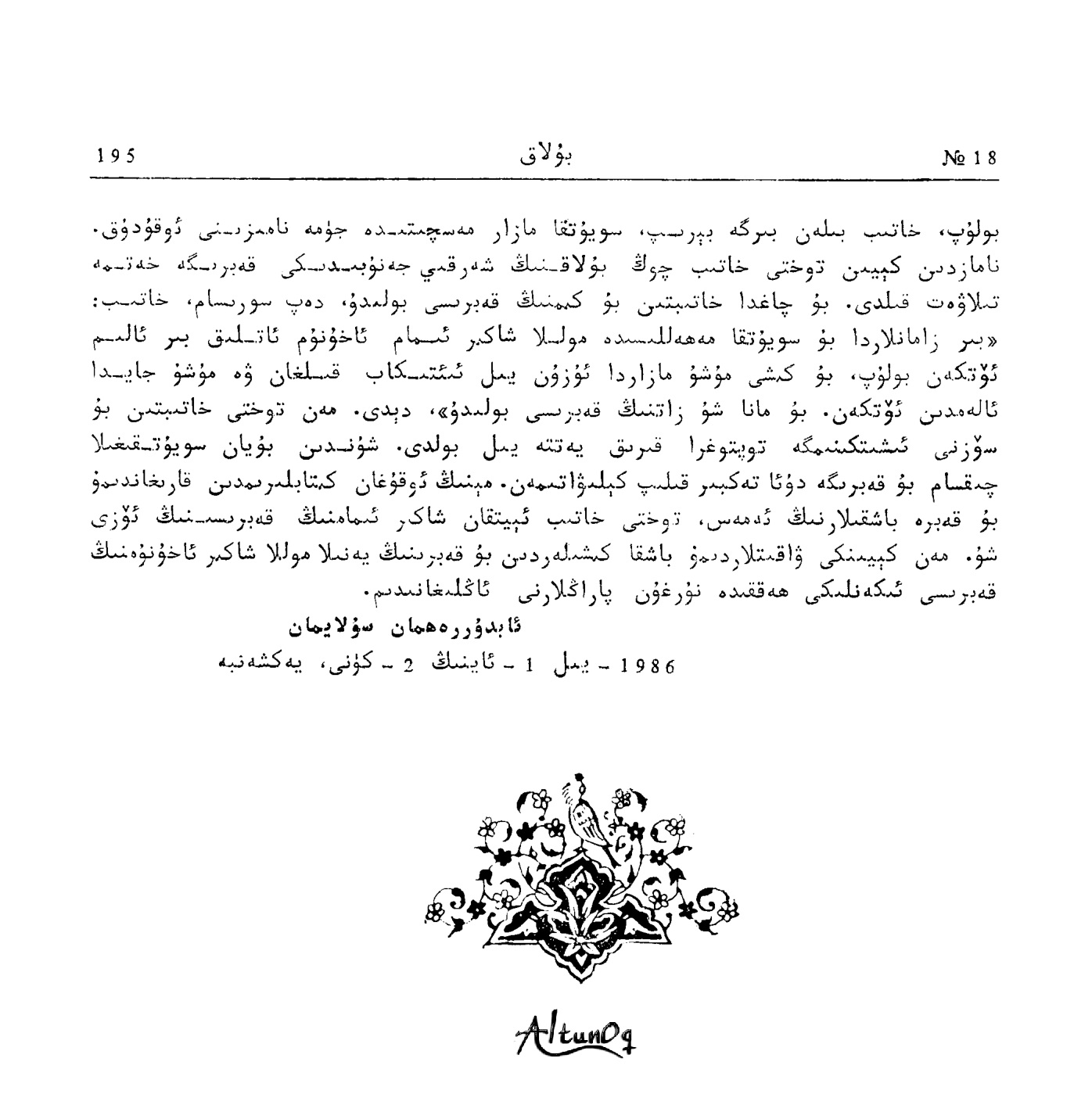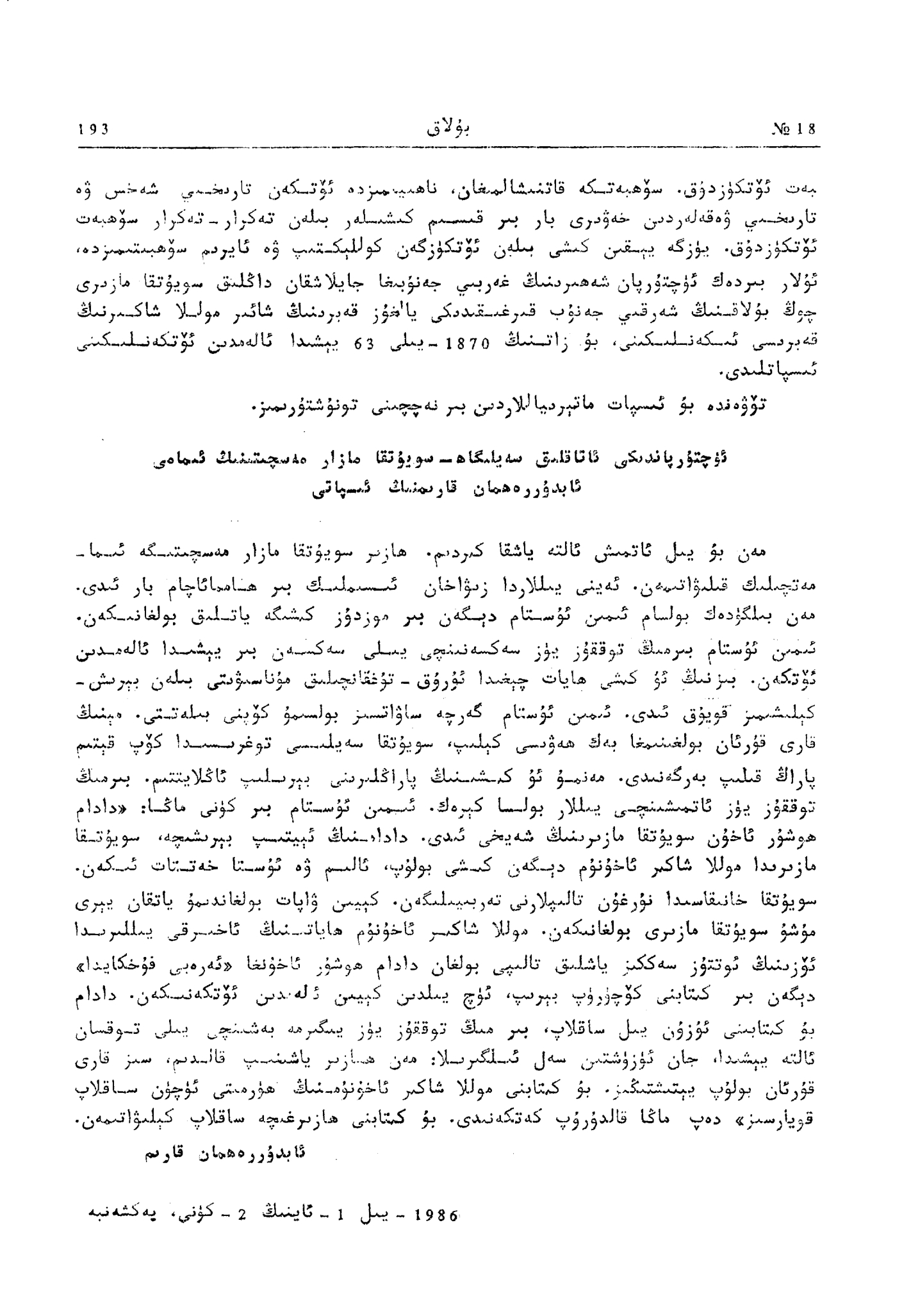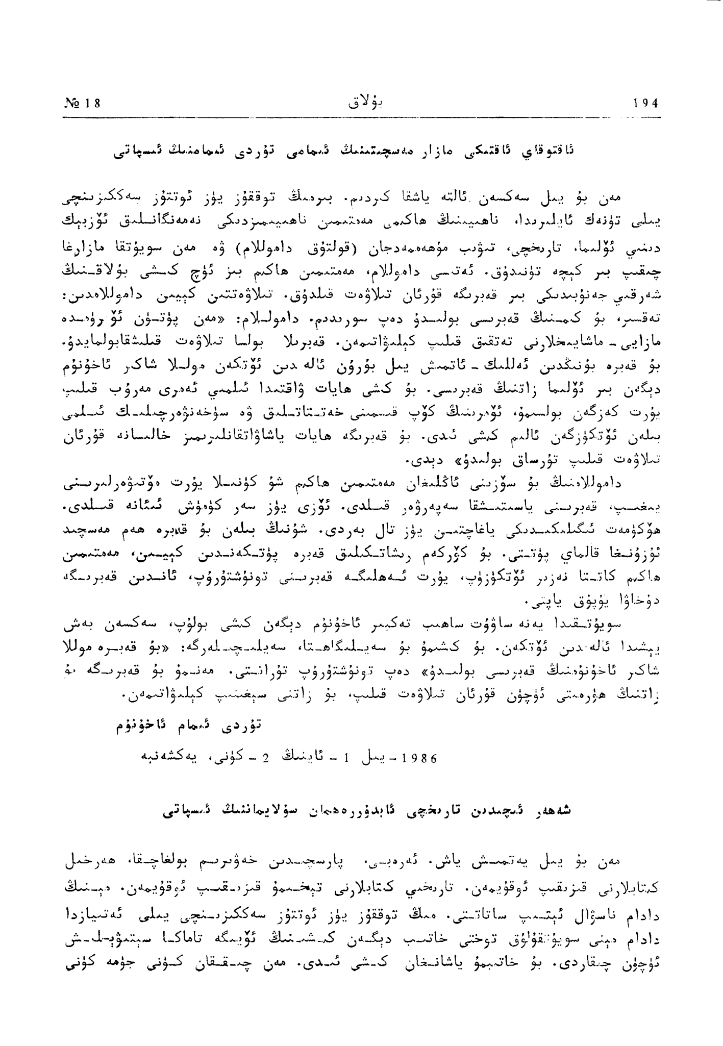 تۆۋەندە دادام تۇرسۇن باراتنىڭ «بۇلاق» ژۇرنىلىنىڭ 1986-يىللىق 18-سانىدىكى ماقالىسىنى ئوقۇرمەنلەرنىڭ دىققىتىگە سۇنىمەن.